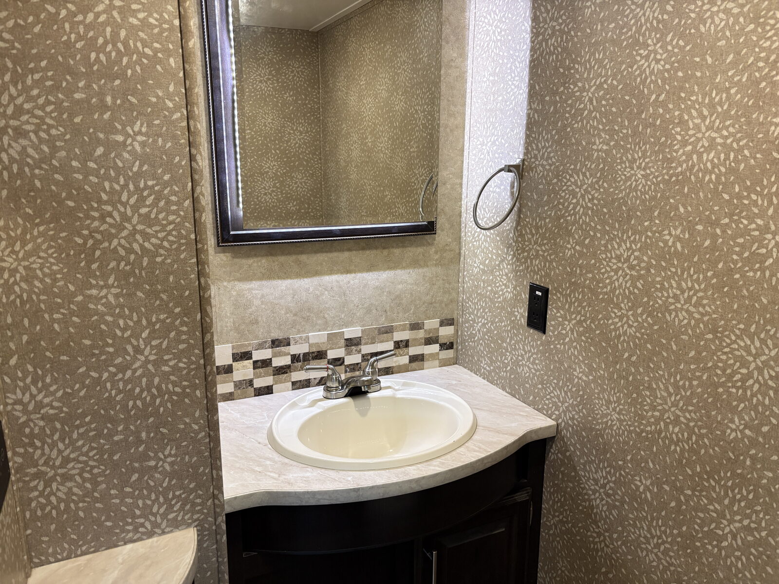 - Bathroom stone and glass tile backsplash