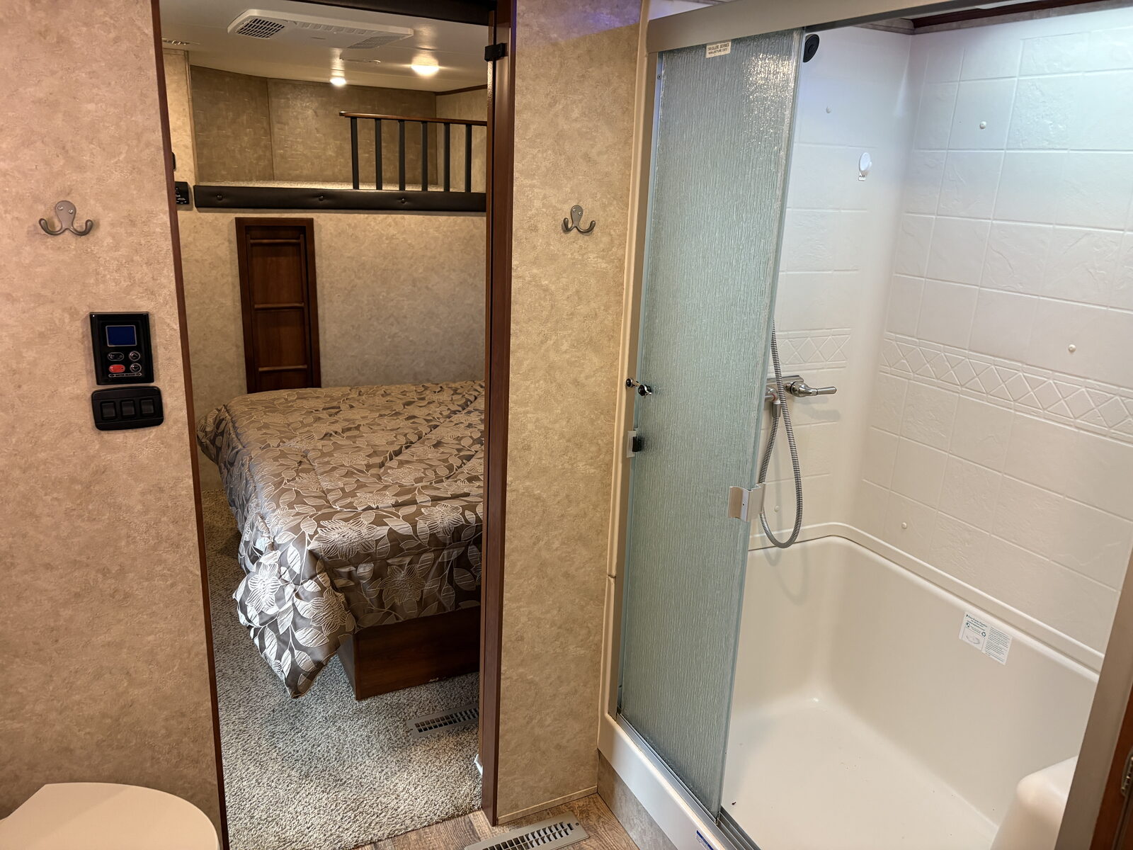 - Residential-style shower with glass door