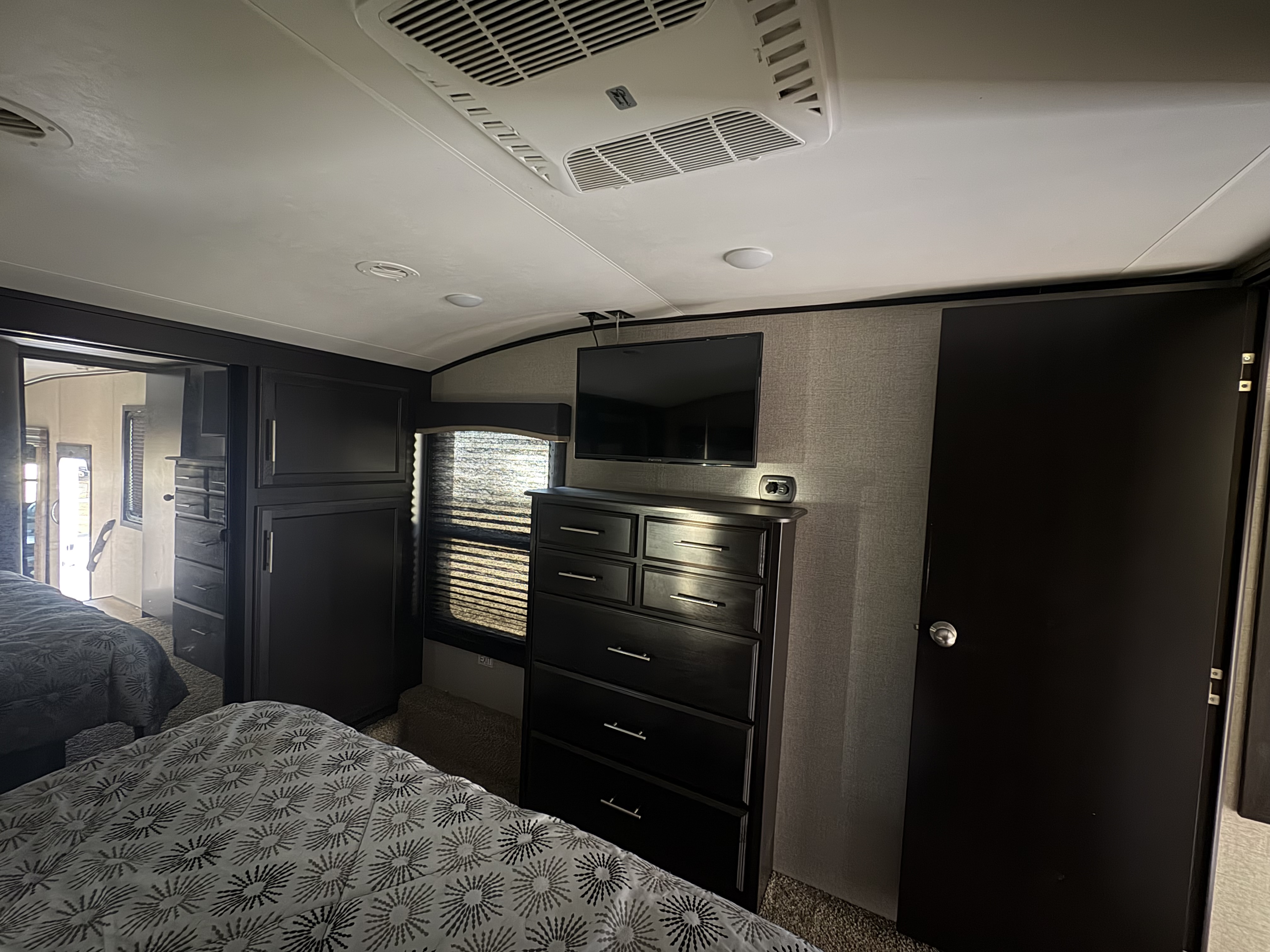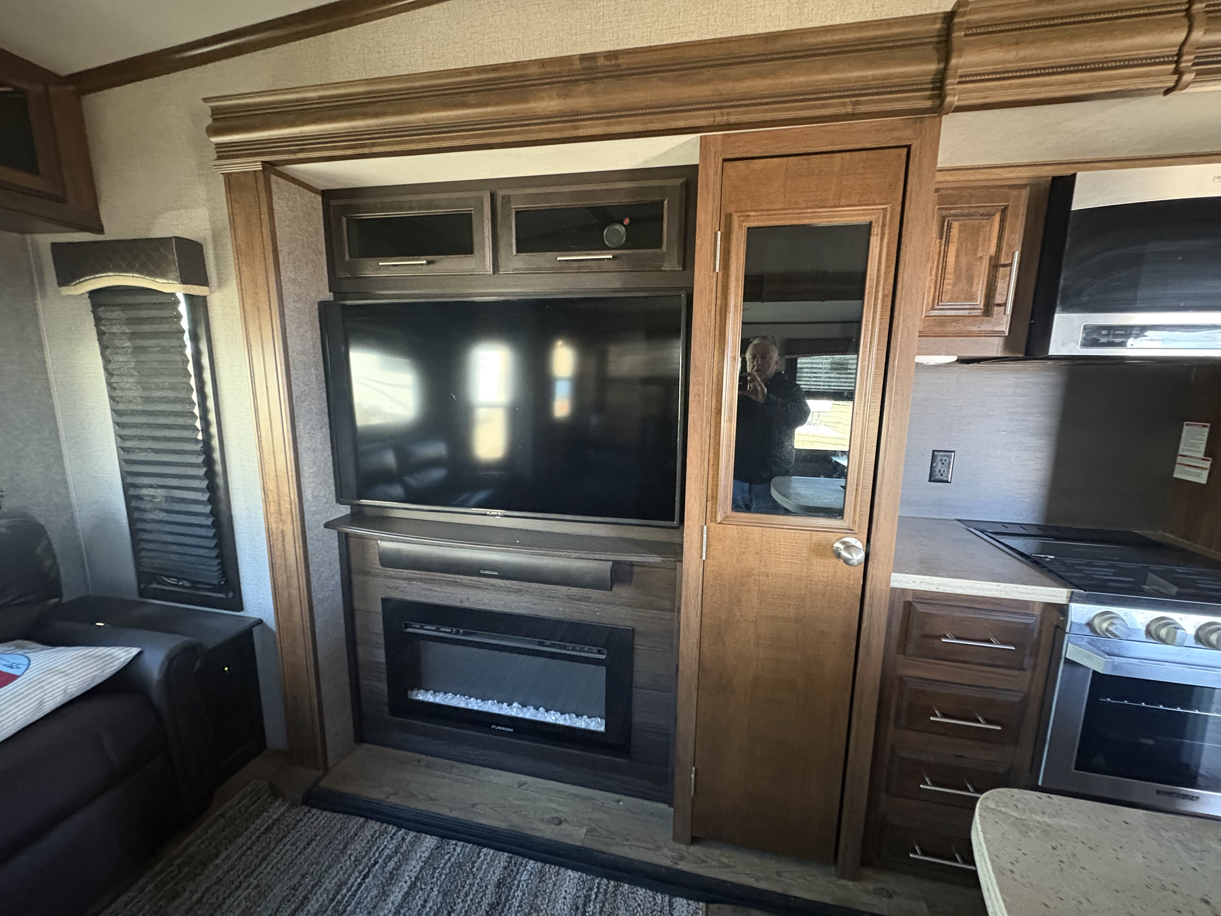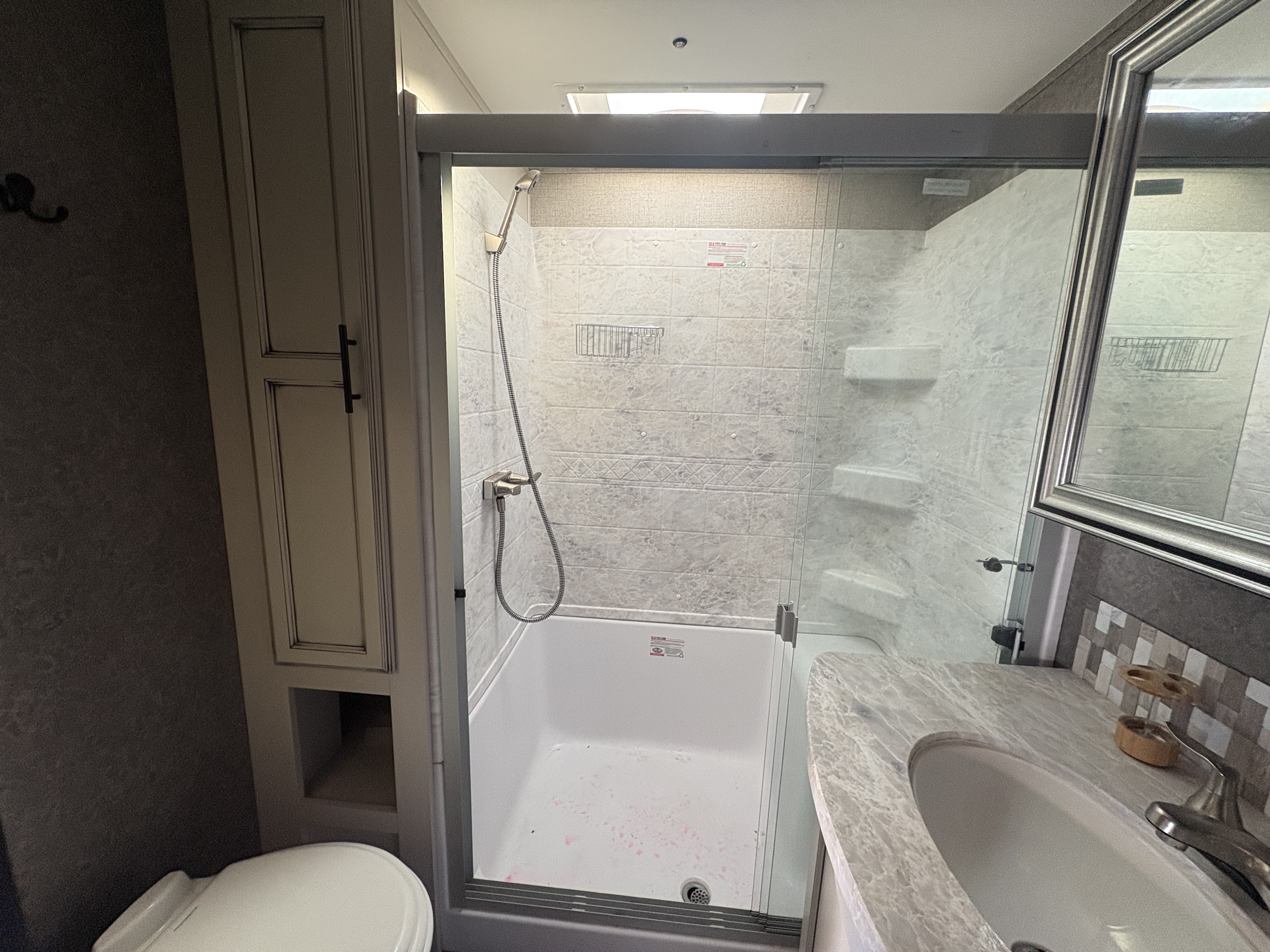- Fully enclosed, LED lit universal docking center with quick connect outside shower, city water connection, and black tank flush
