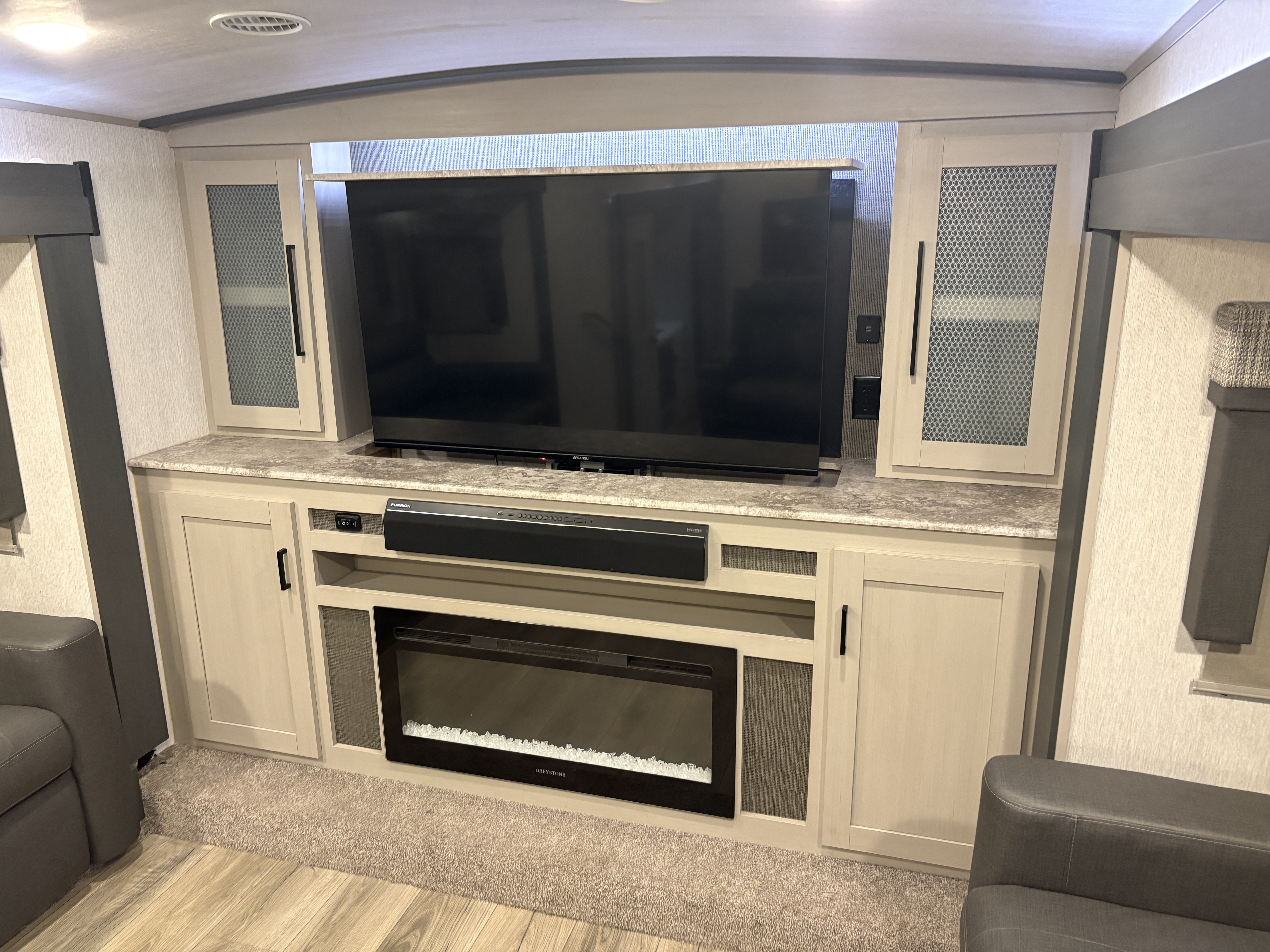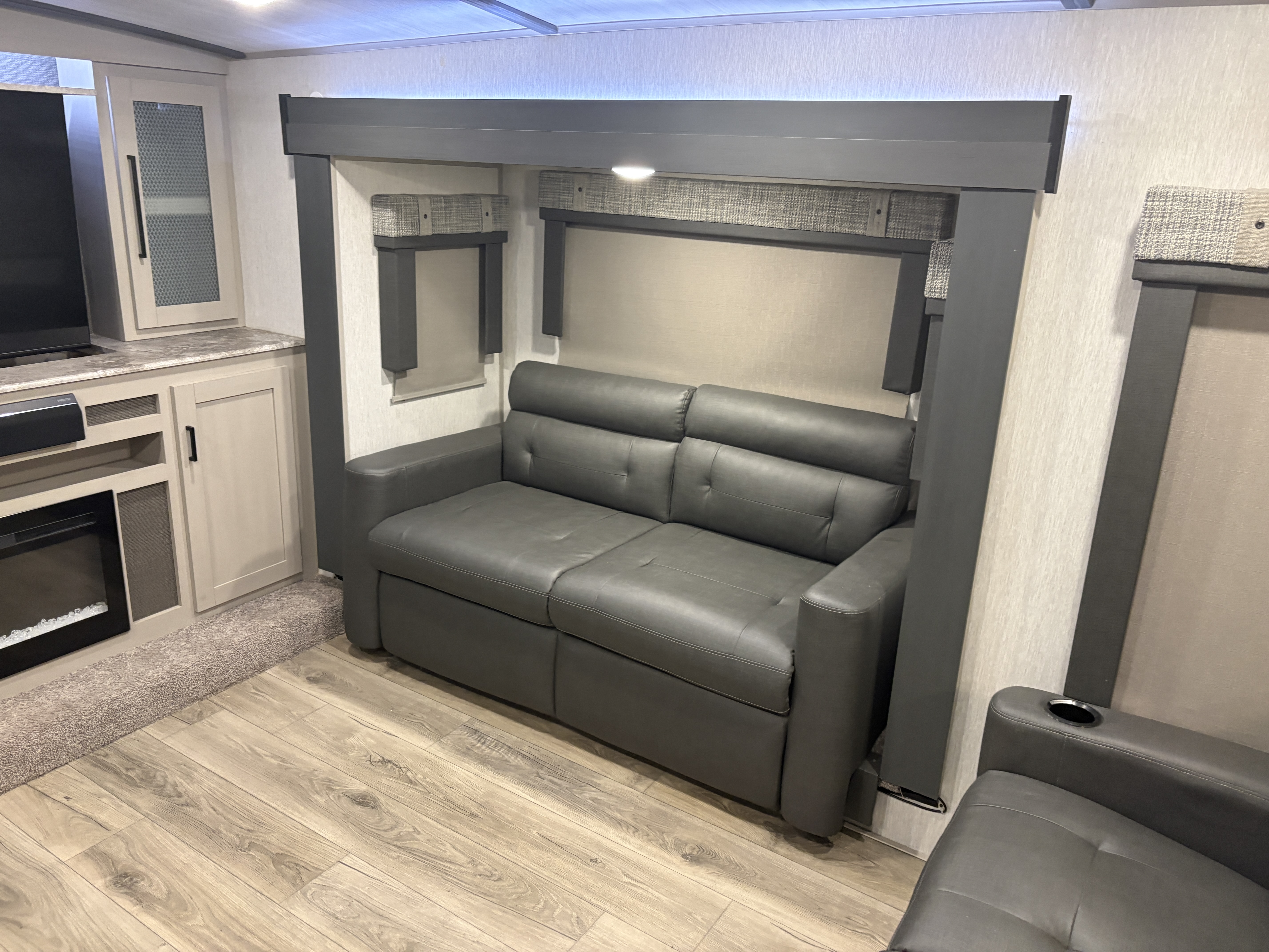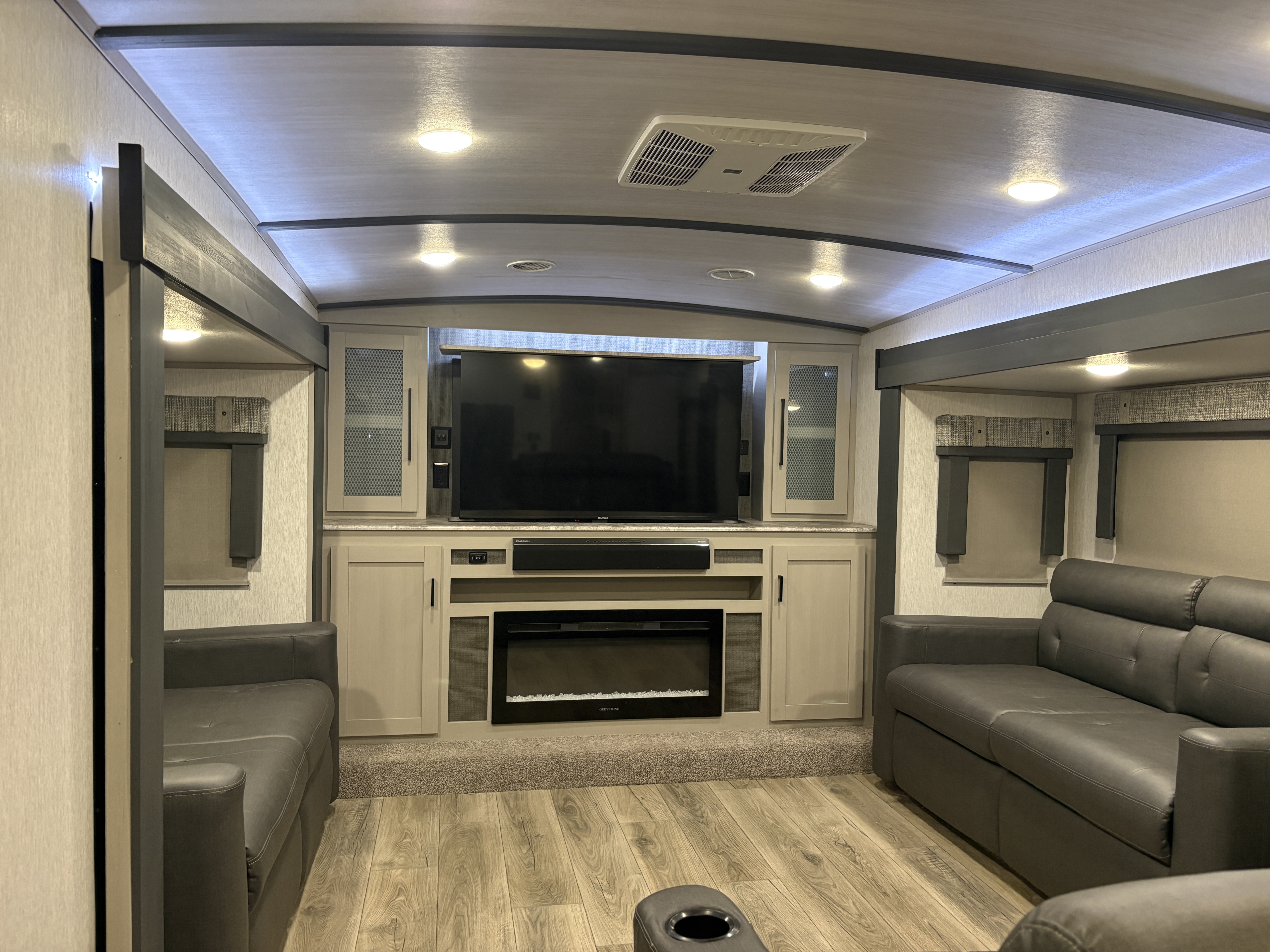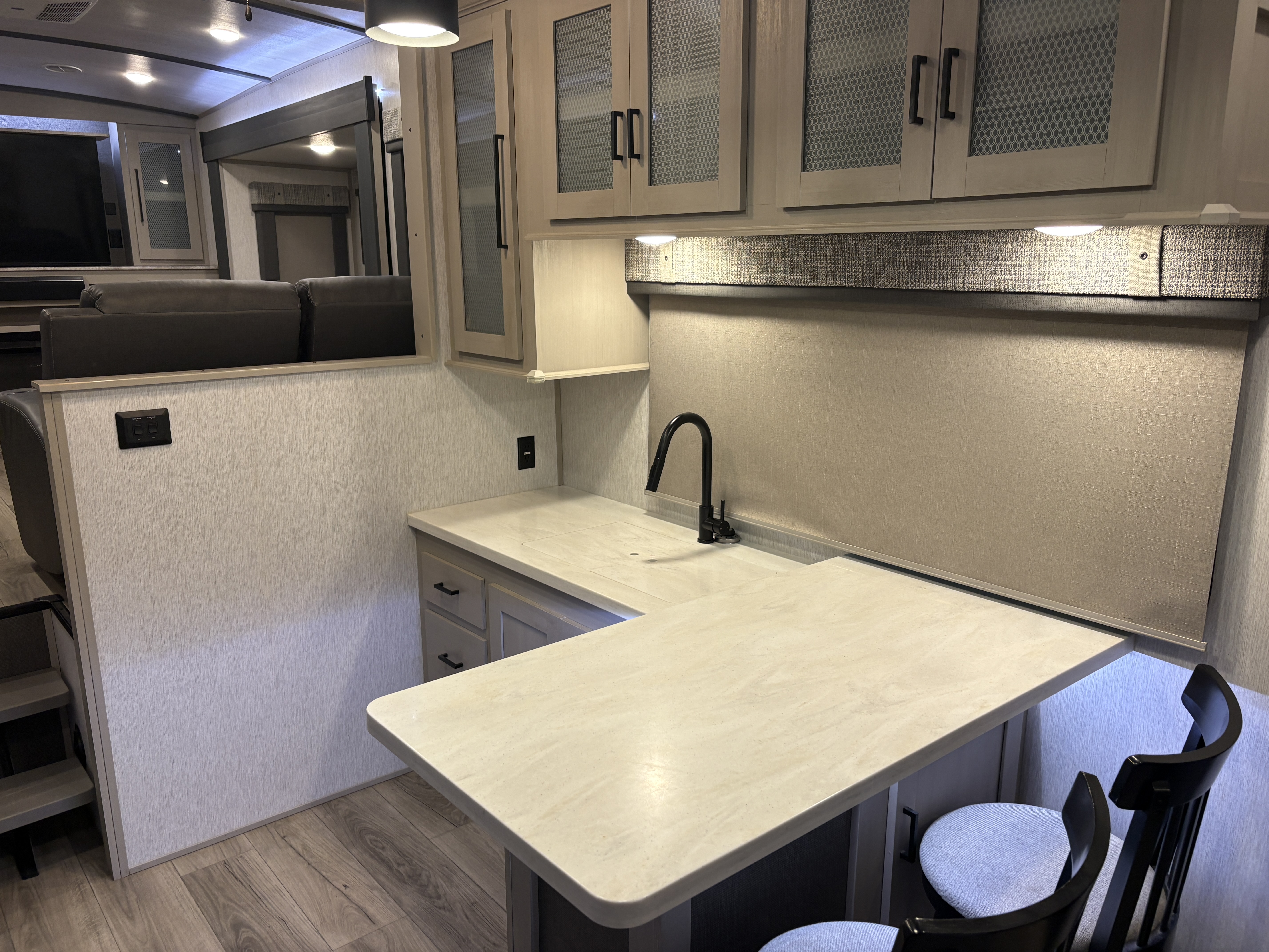 The 36FL features an elevated front living room with two sofas, panoramic windows, theater seating, ottoman, and large entertainment center. The open residential kitchen, features a breakfast bar, pantry, swivel bar stools, another panoramic window, and a half bath. The rear master bedroom suite includes a king bed, dresser and wardrobe for storage, and a full bath that includes washer/dryer hookup and a residential walk-in shower. And, a bar and entertainment center awaits you outside.