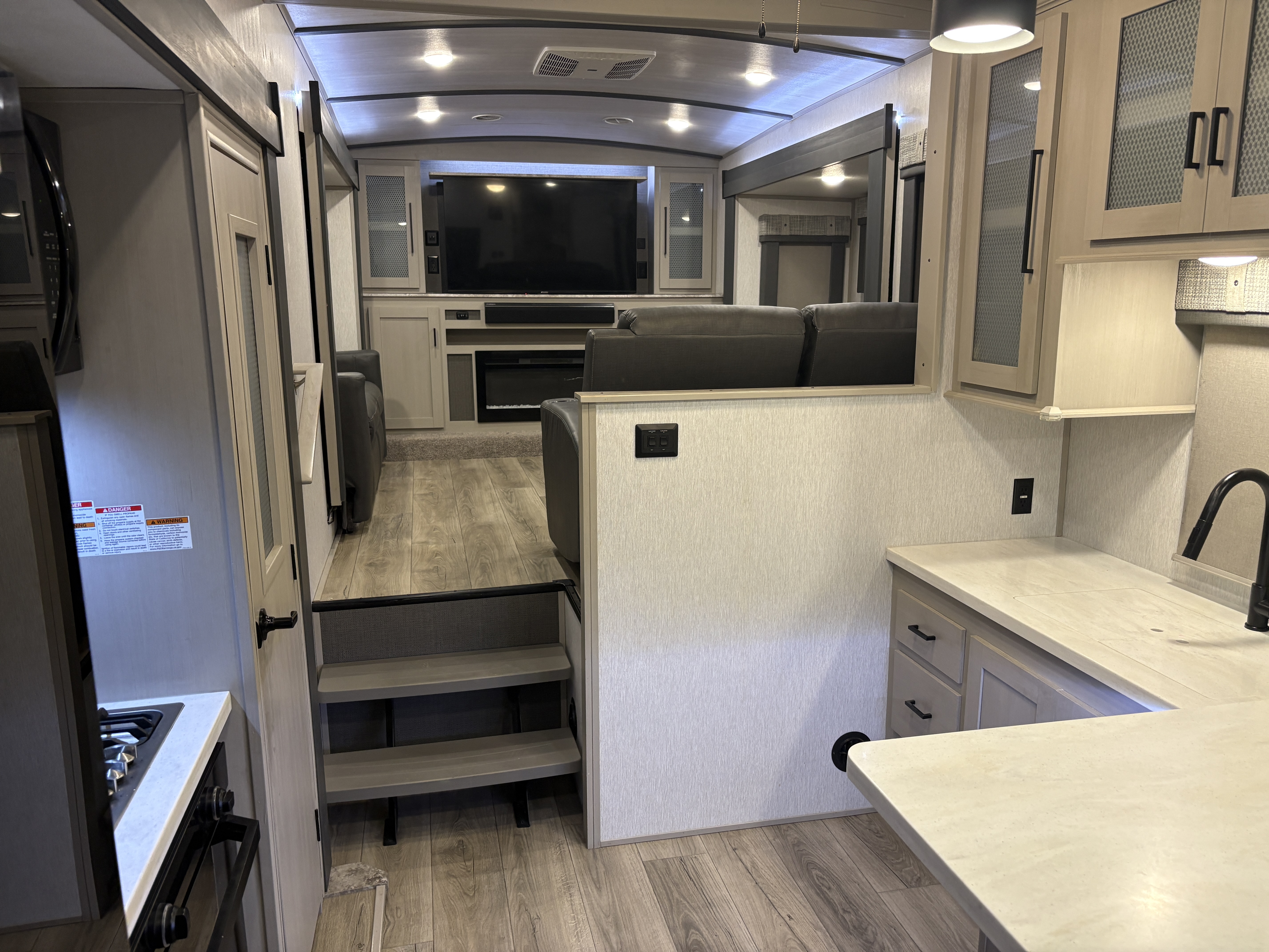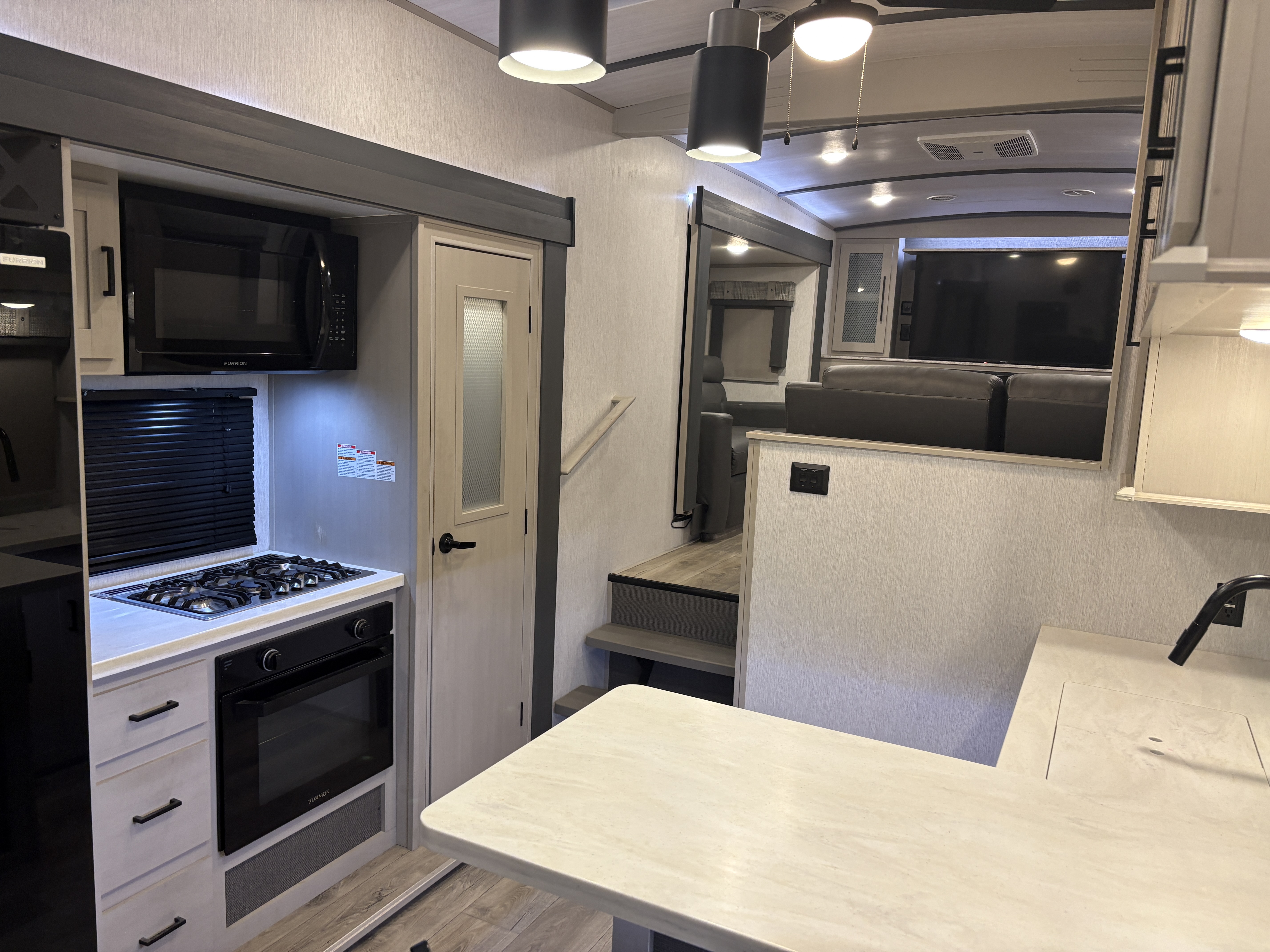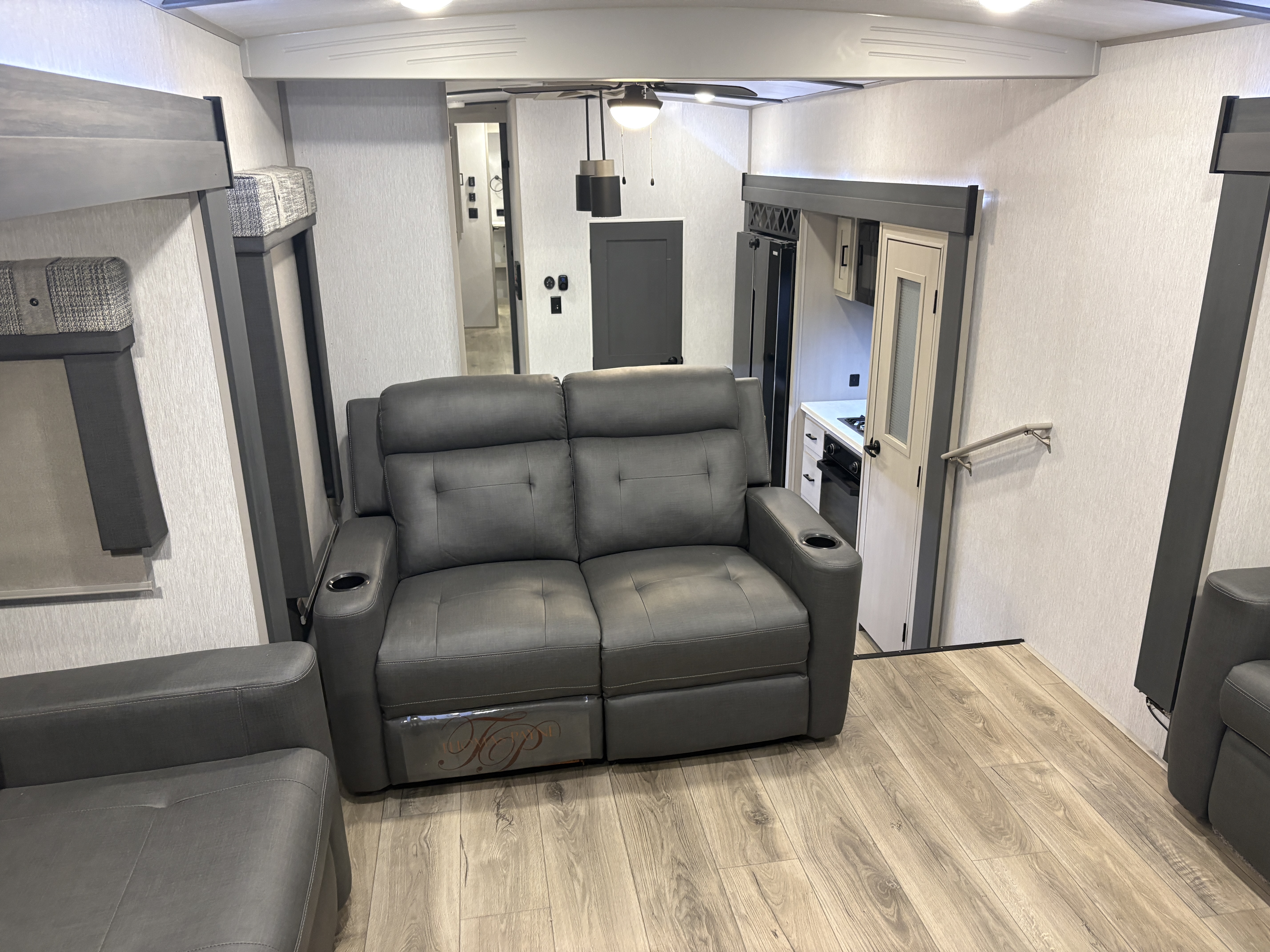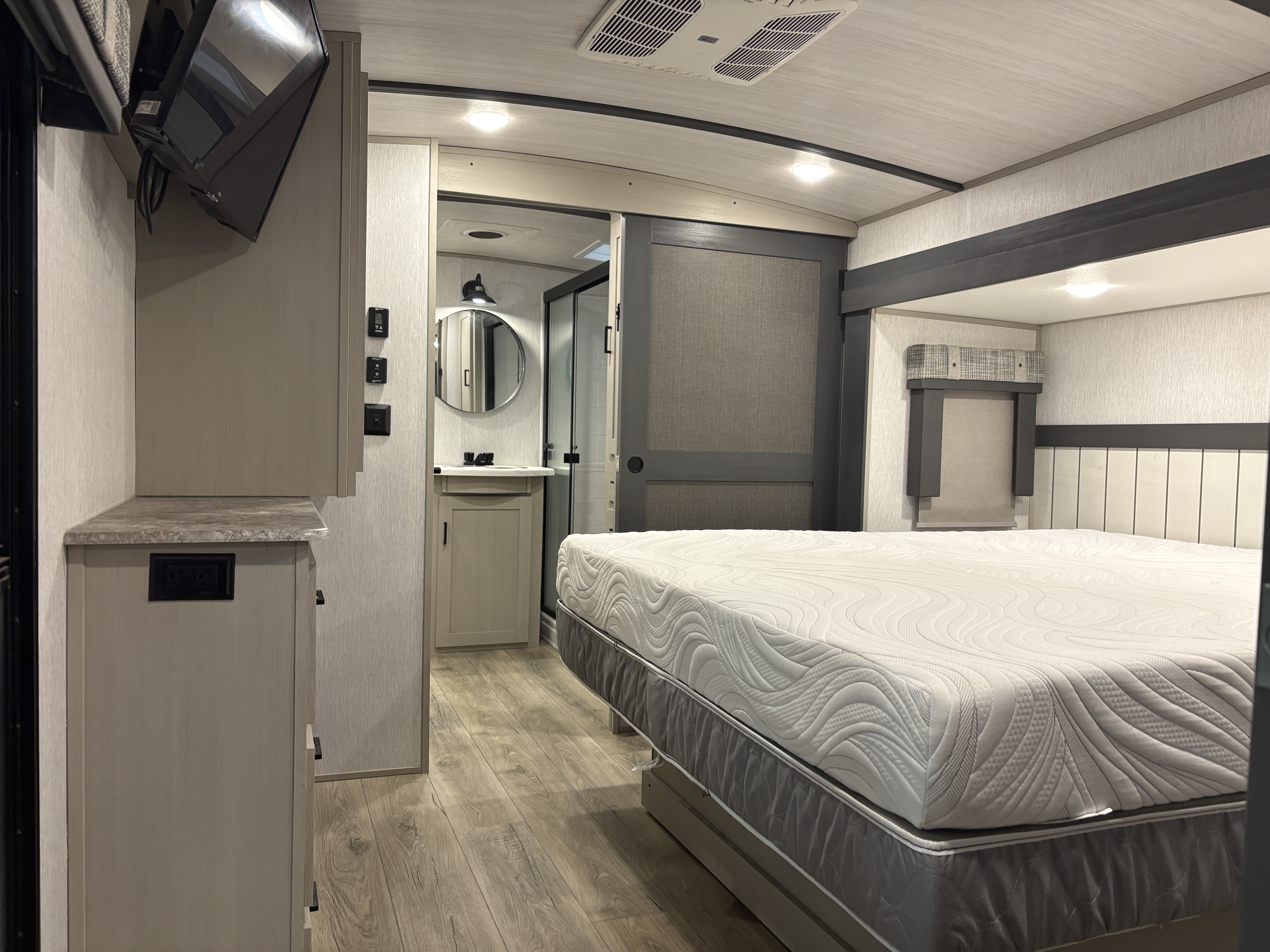 The 36FL features an elevated front living room with two sofas, panoramic windows, theater seating, ottoman, and large entertainment center. The open residential kitchen, features a breakfast bar, pantry, swivel bar stools, another panoramic window, and a half bath. The rear master bedroom suite includes a king bed, dresser and wardrobe for storage, and a full bath that includes washer/dryer hookup and a residential walk-in shower. And, a bar and entertainment center awaits you outside.