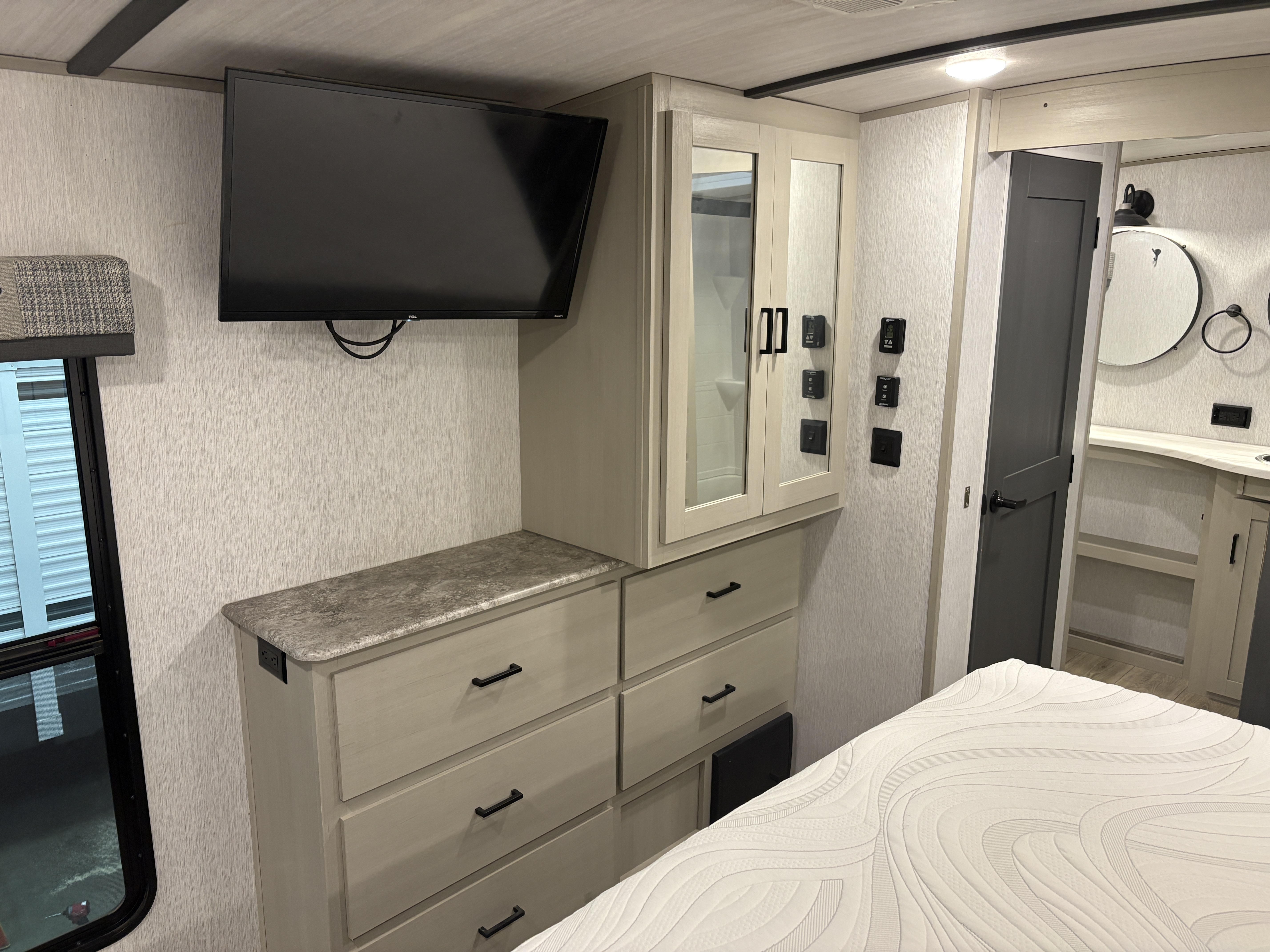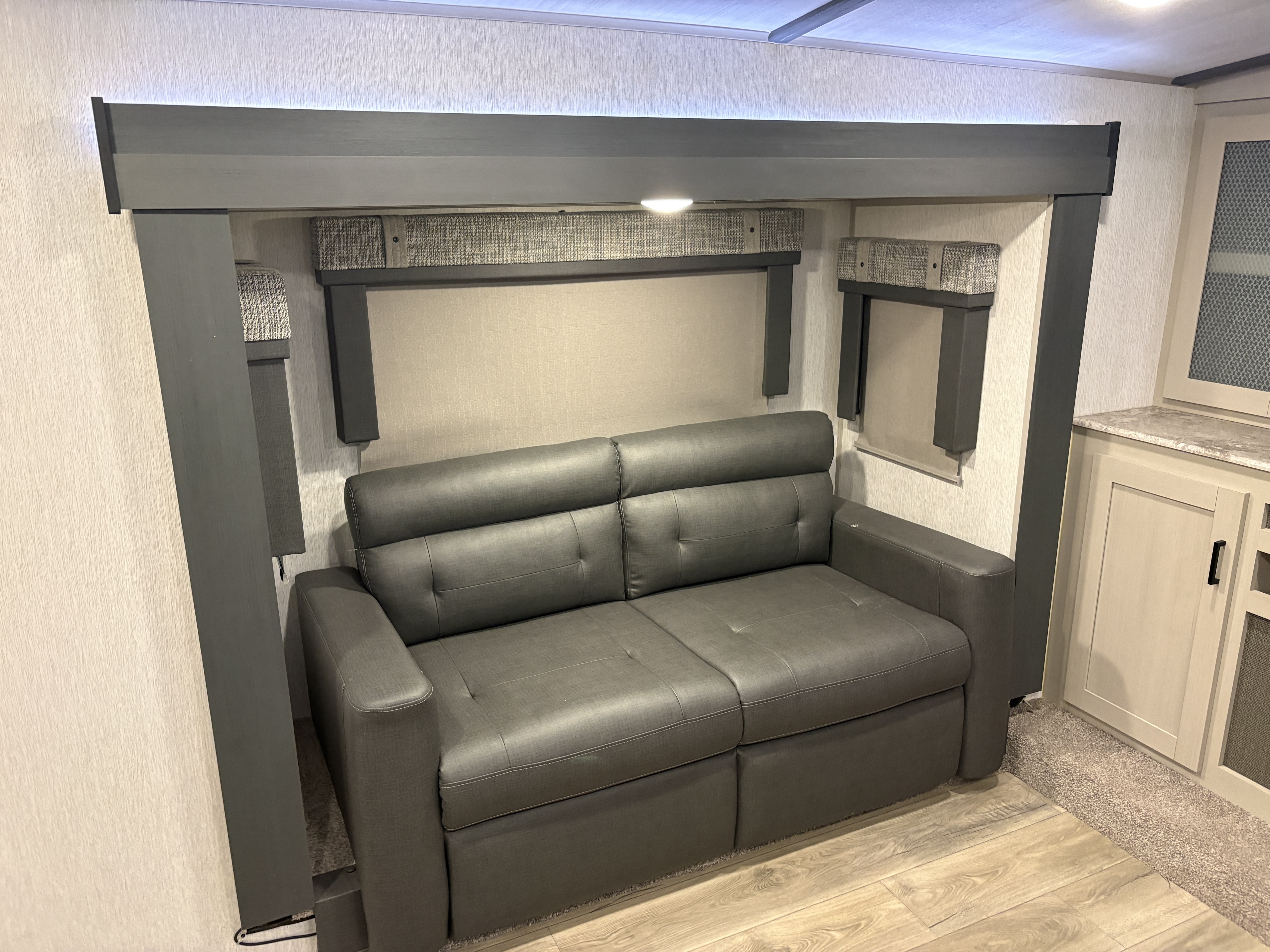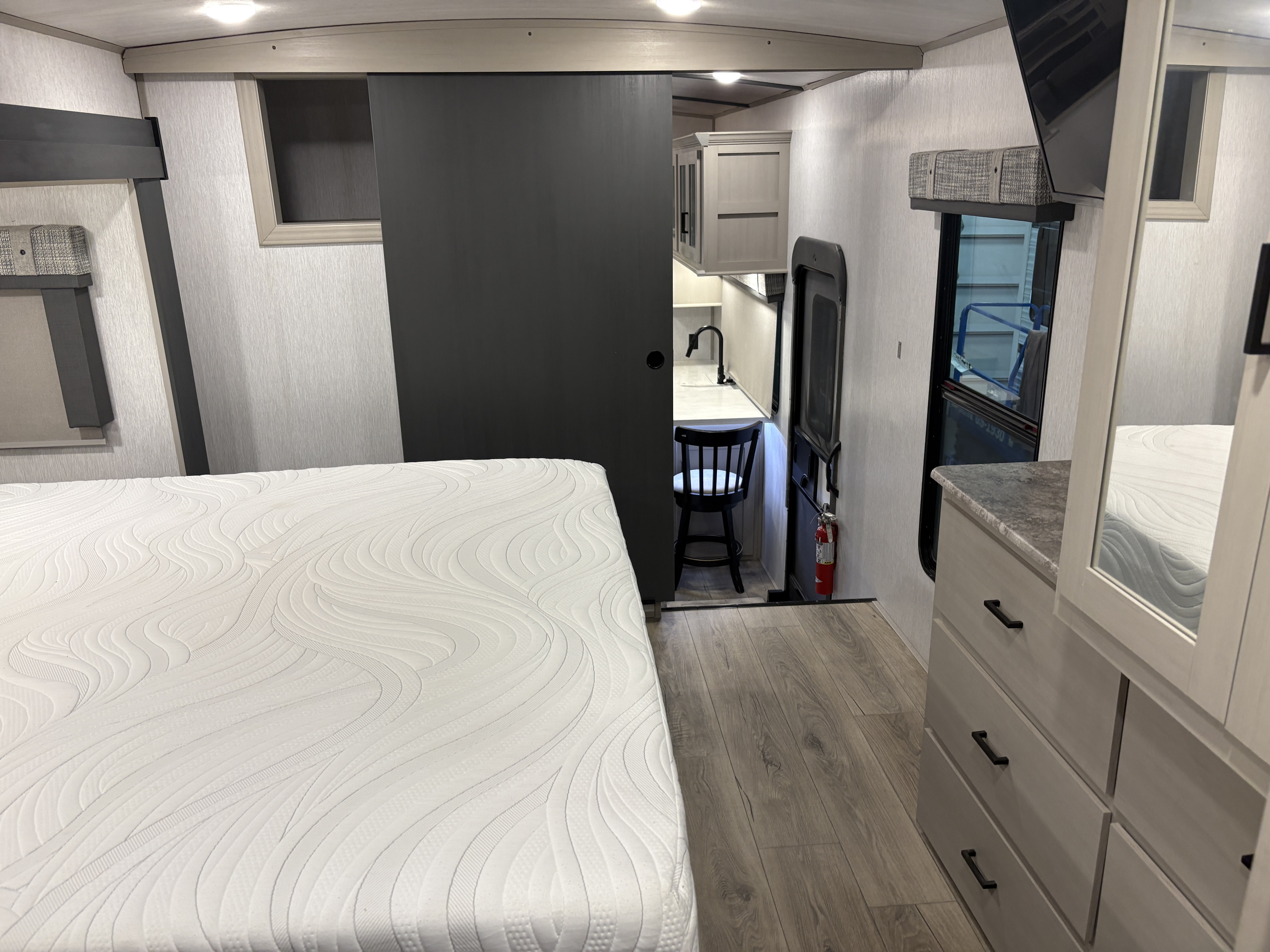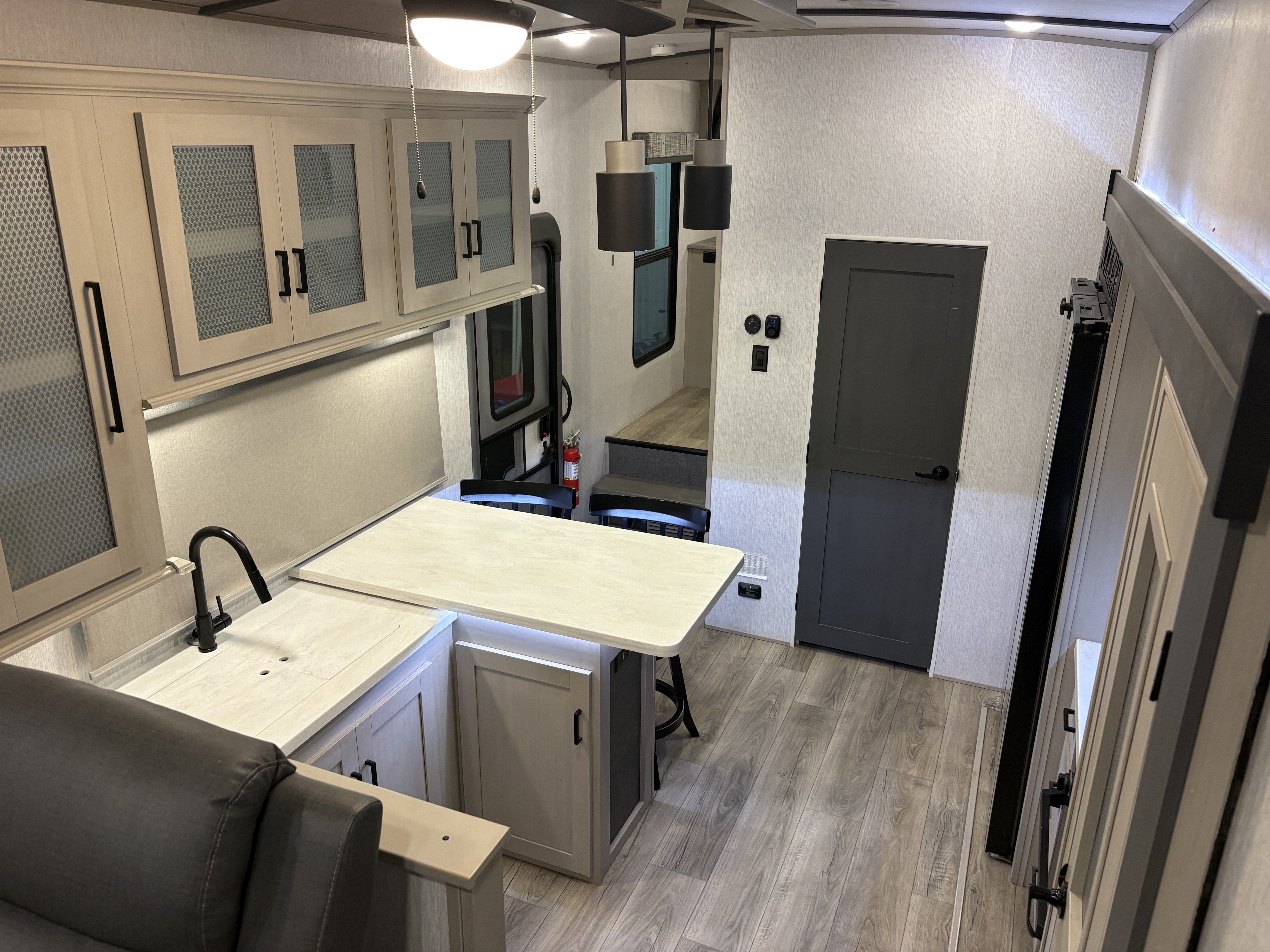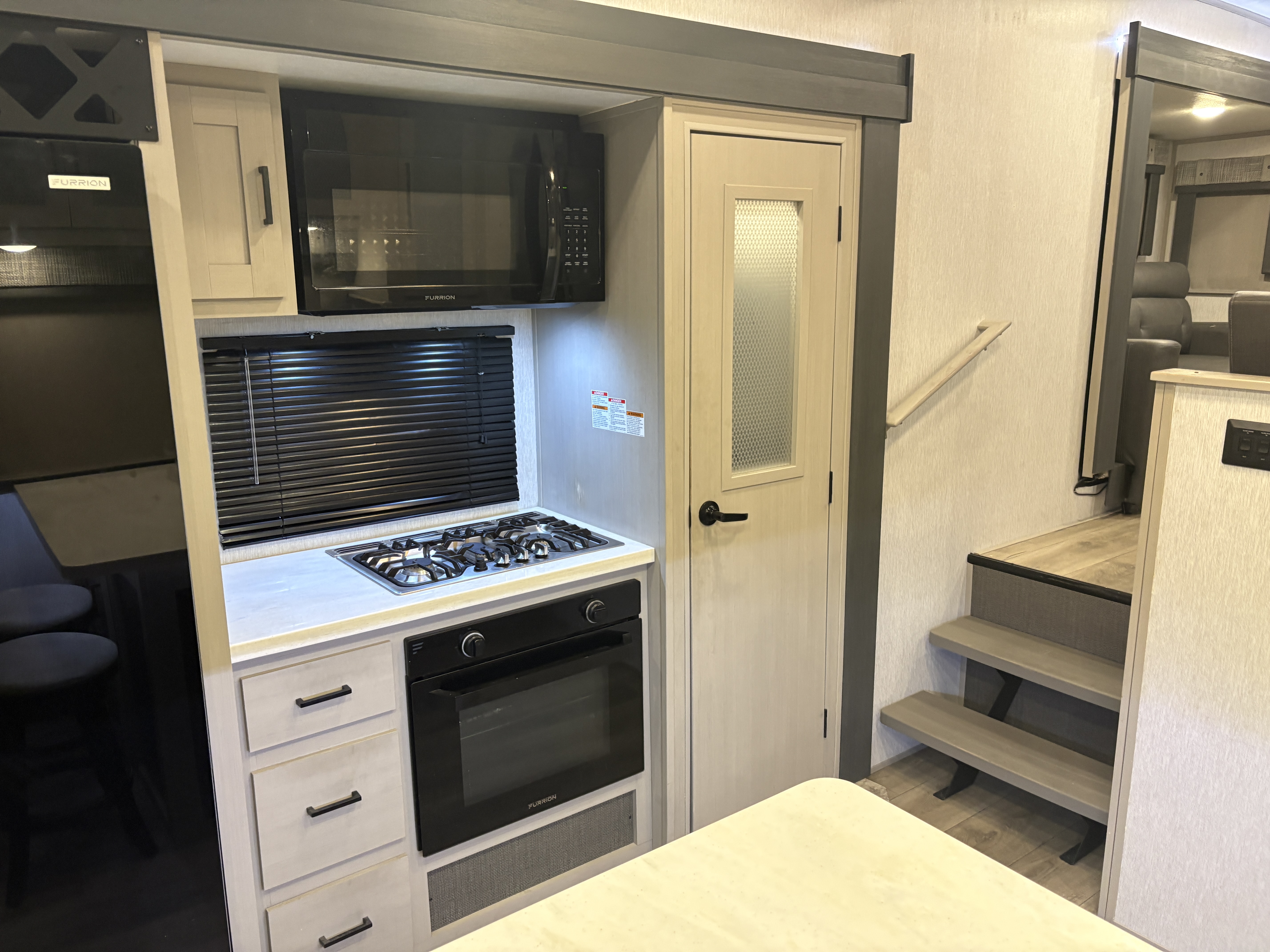 The 36FL features an elevated front living room with two sofas, panoramic windows, theater seating, ottoman, and large entertainment center. The open residential kitchen, features a breakfast bar, pantry, swivel bar stools, another panoramic window, and a half bath. The rear master bedroom suite includes a king bed, dresser and wardrobe for storage, and a full bath that includes washer/dryer hookup and a residential walk-in shower. And, a bar and entertainment center awaits you outside.