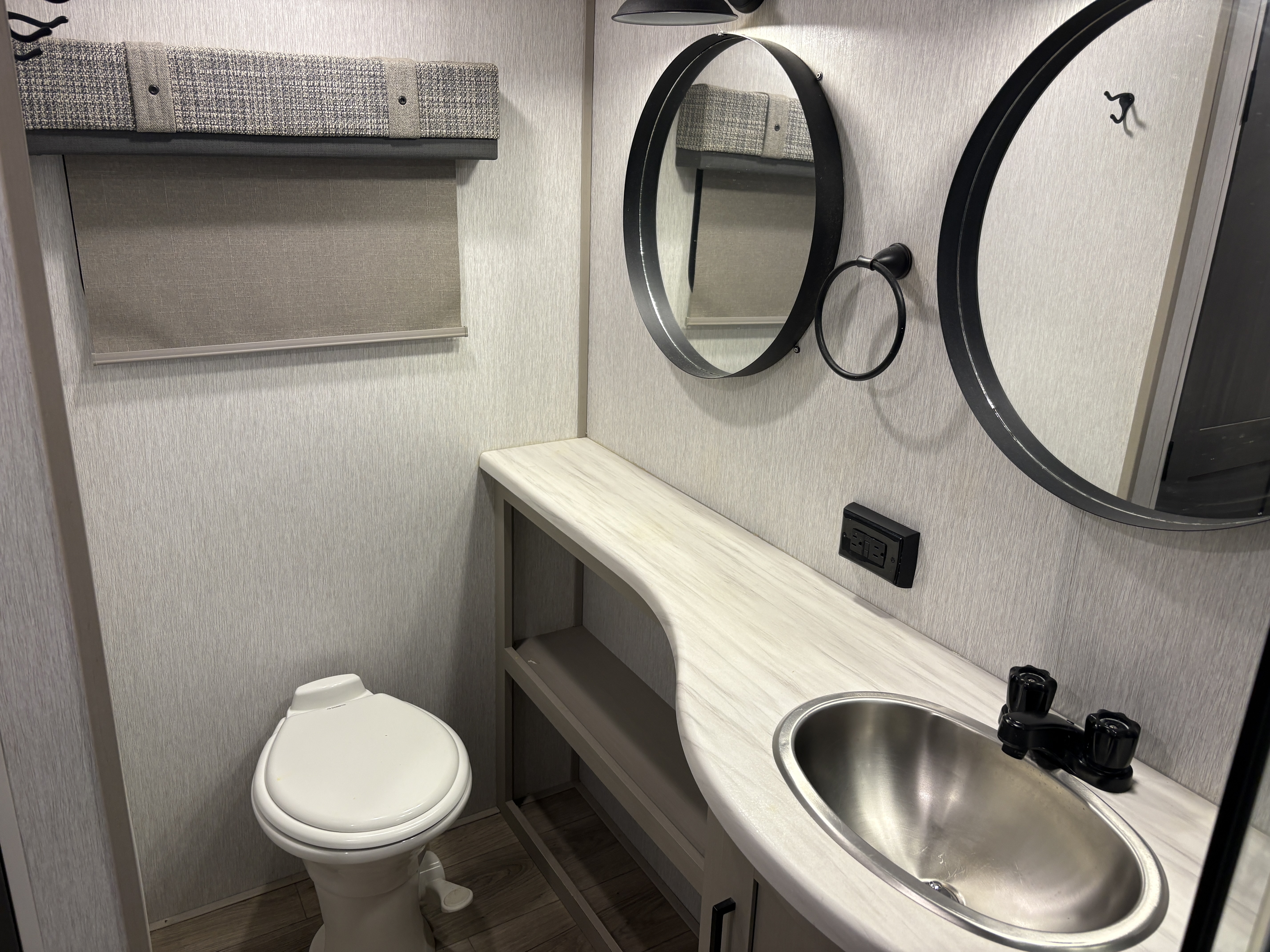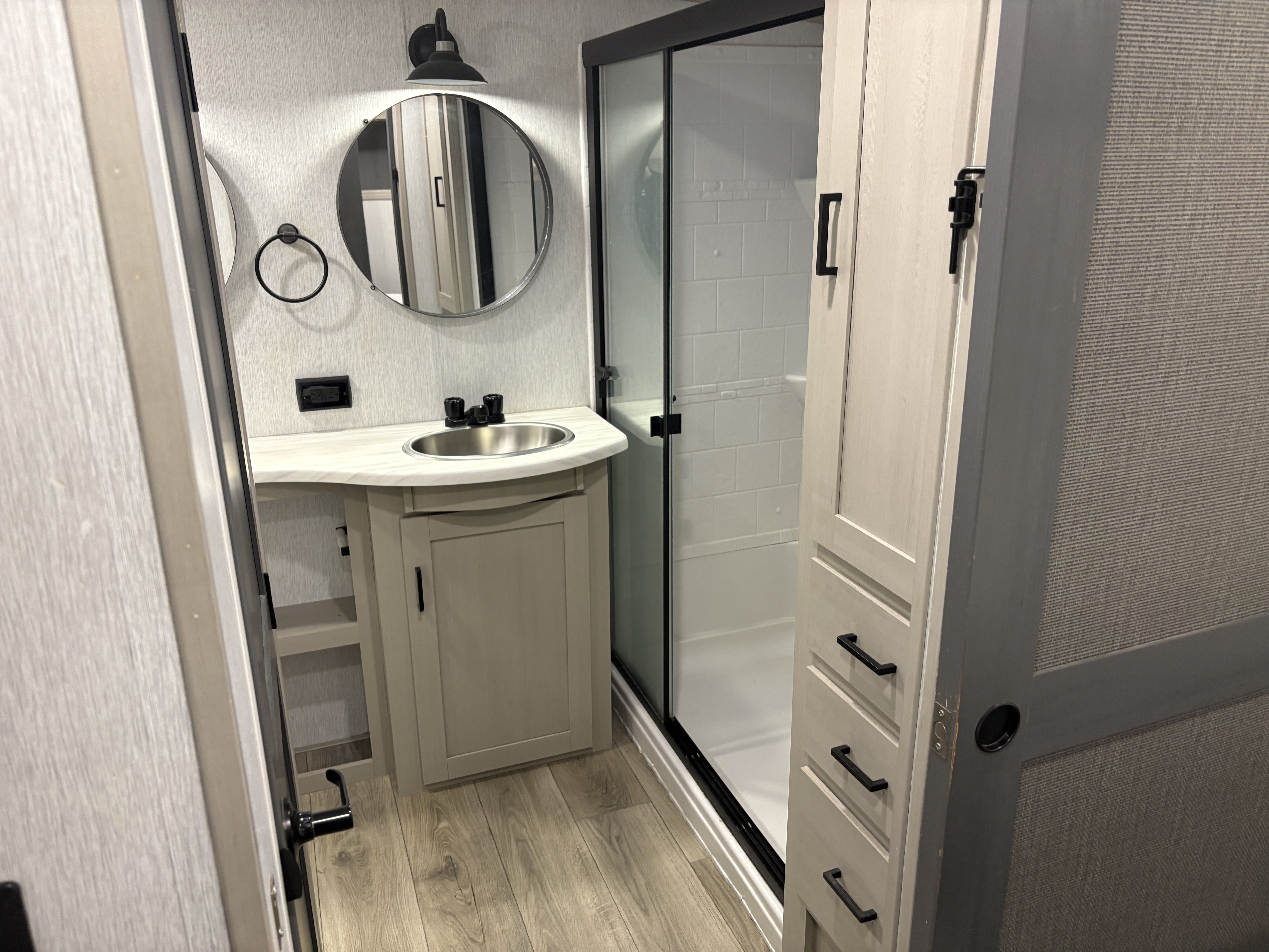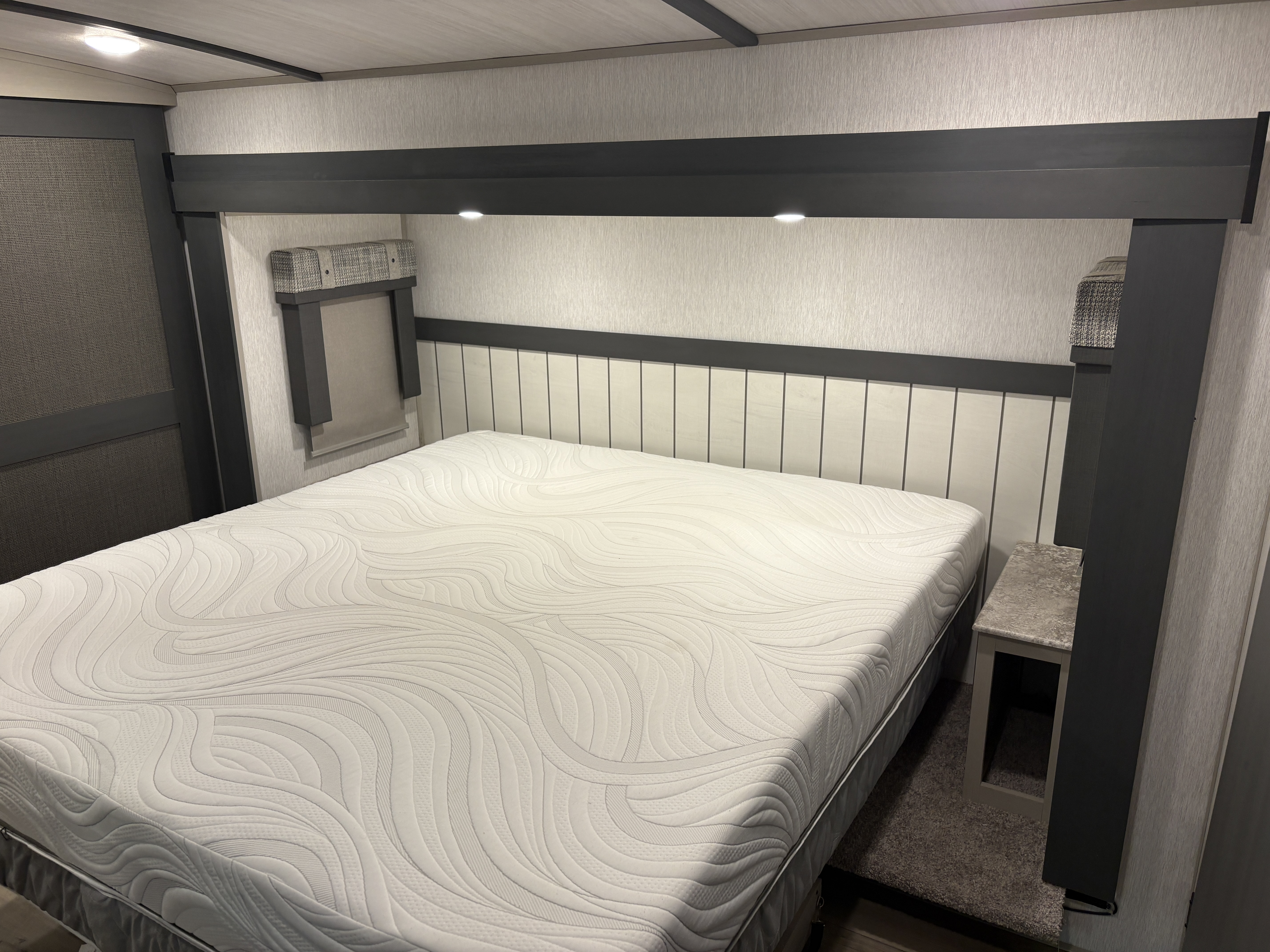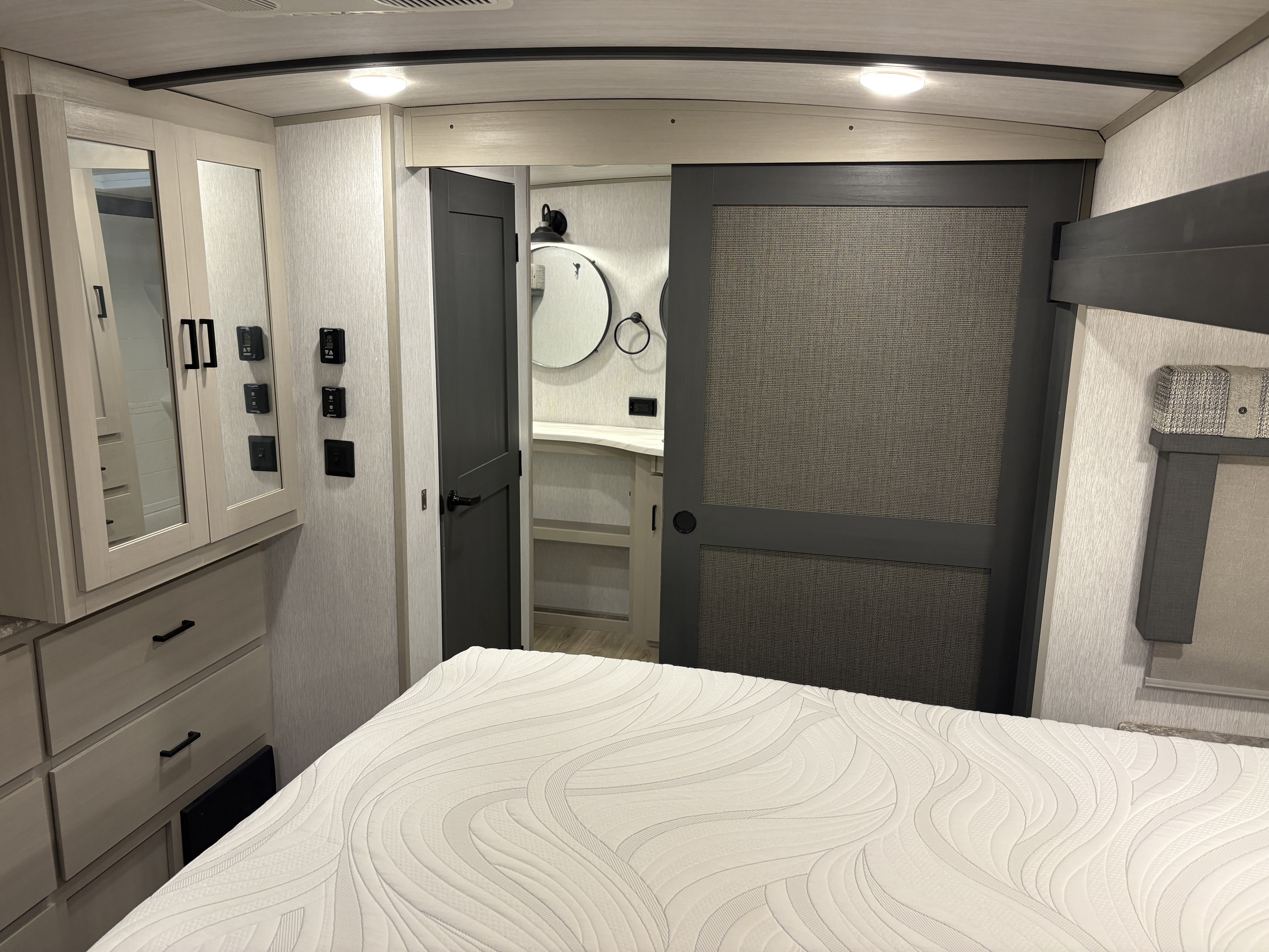 The 36FL features an elevated front living room with two sofas, panoramic windows, theater seating, ottoman, and large entertainment center. The open residential kitchen, features a breakfast bar, pantry, swivel bar stools, another panoramic window, and a half bath. The rear master bedroom suite includes a king bed, dresser and wardrobe for storage, and a full bath that includes washer/dryer hookup and a residential walk-in shower. And, a bar and entertainment center awaits you outside.