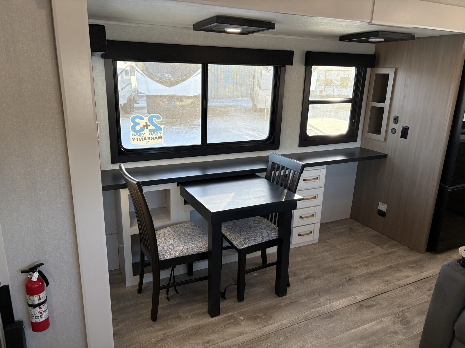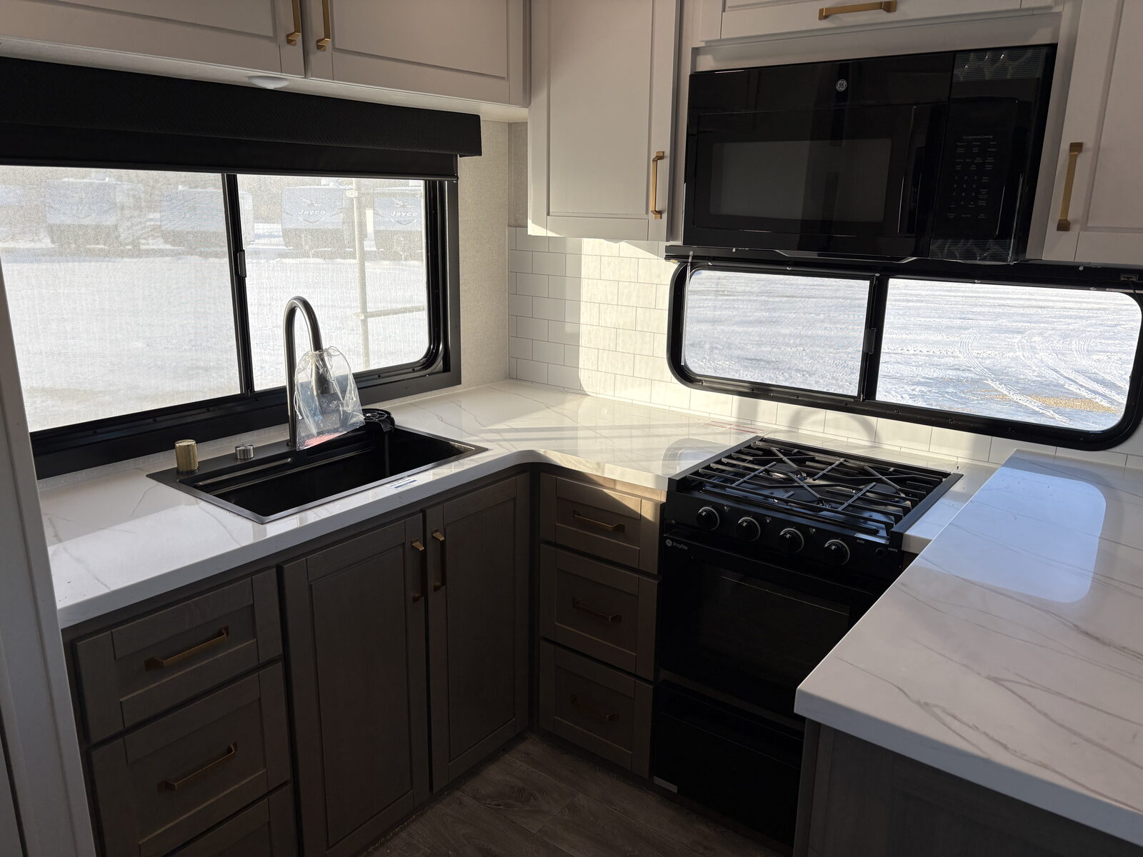 The kitchen in the Eagle is designed for culinary exploration, featuring reliable GE appliances, including a stove with an edge-to-edge grate and an easy-to-clean oven. The innovative all-in-one sink serves multiple functions, offering versatility for both preparation and cleanup. Ready for outdoor cooking? The optional Halo Griddle is perfect for your adventures, featuring a windproof design, dual-zone burner, and a temperature range from 300 to 500 degrees—perfect for grilling whatever inspires you. And when the weather shifts, the foldable dinette chairs and pivoting table with an outlet below let you quickly turn the indoor office space into a cozy dining area. Set the perfect ambiance with the "Blue Sync" audio system and MB Quart speakers, delivering high-quality sound for any setting.