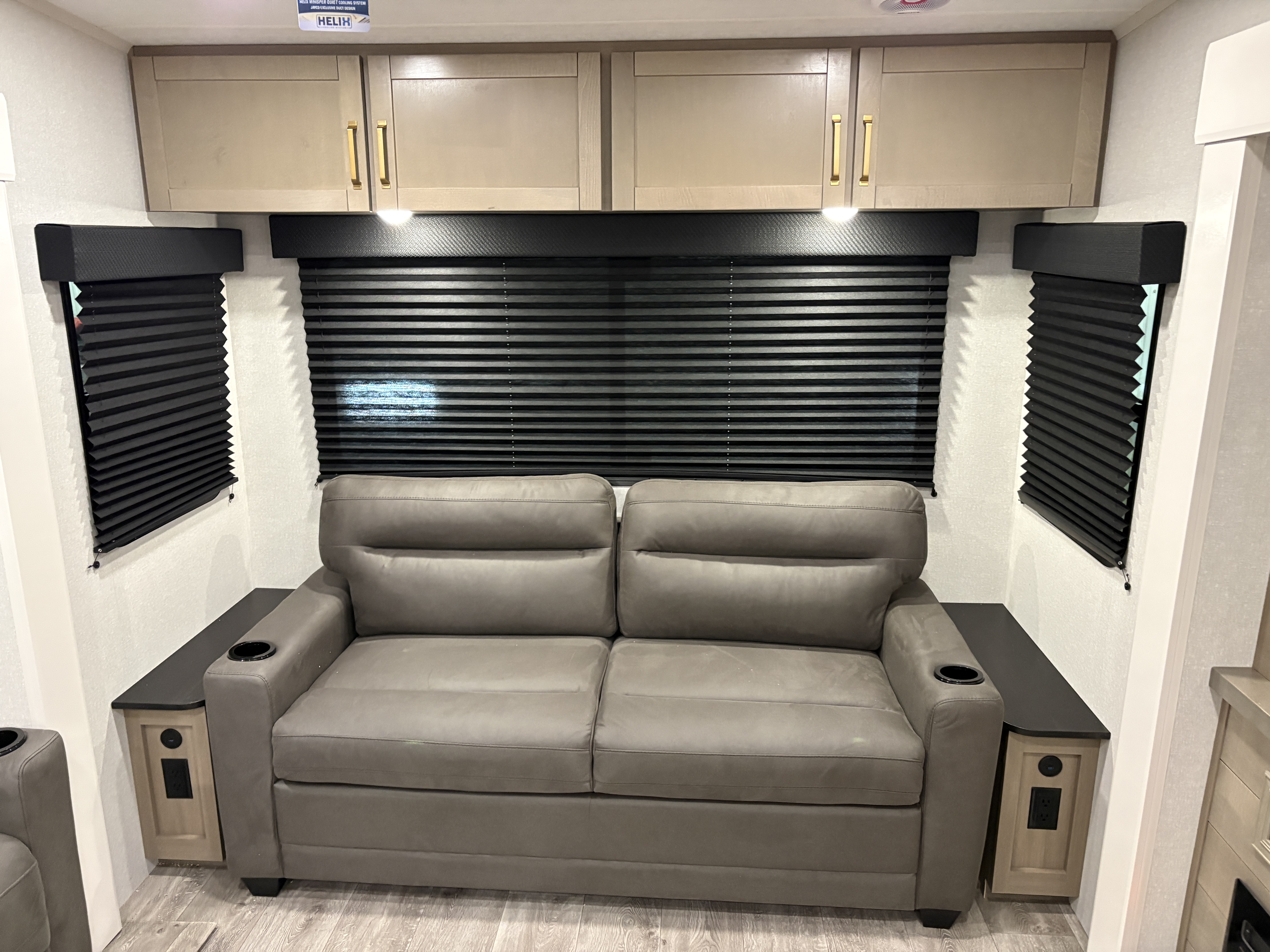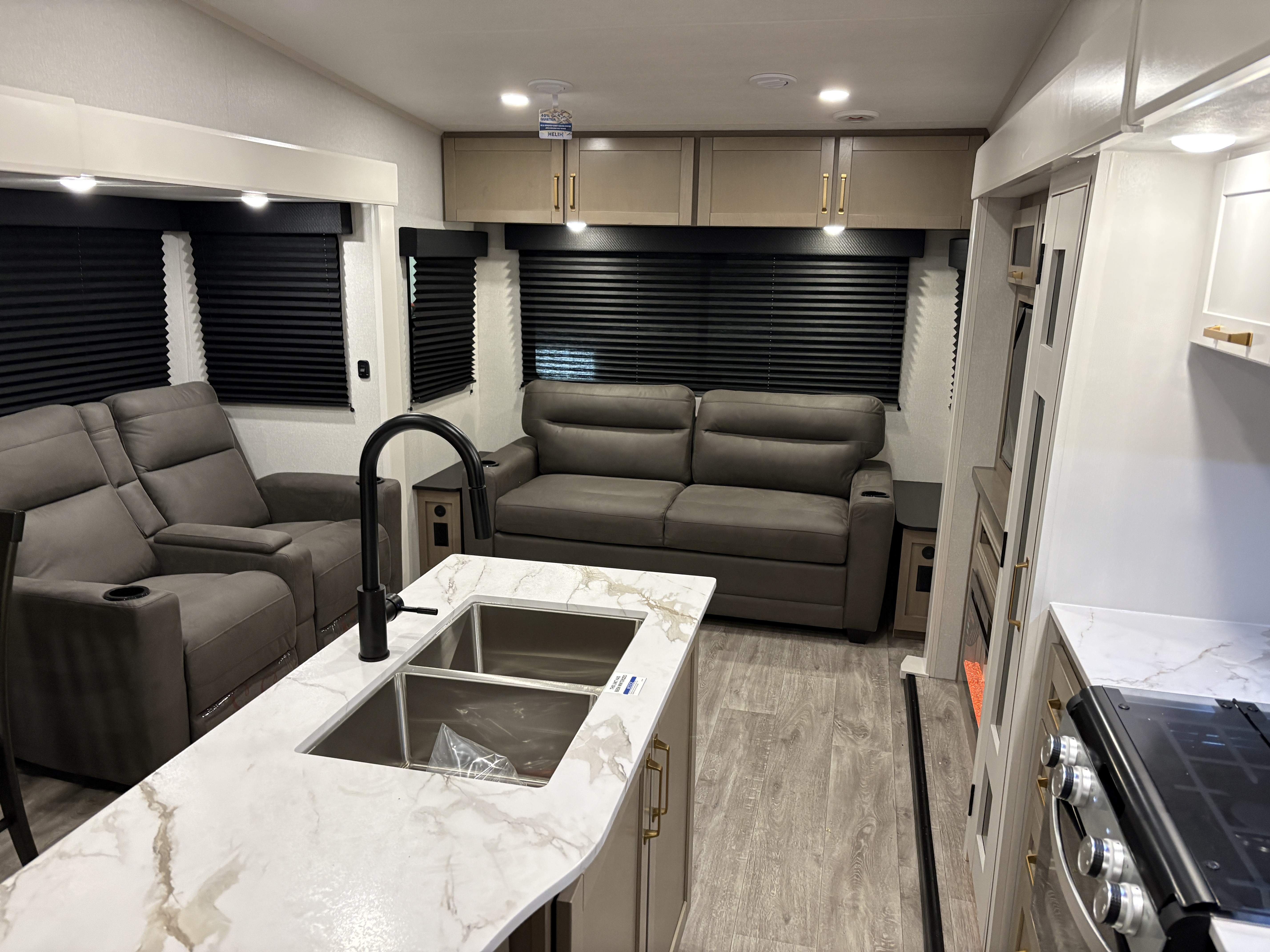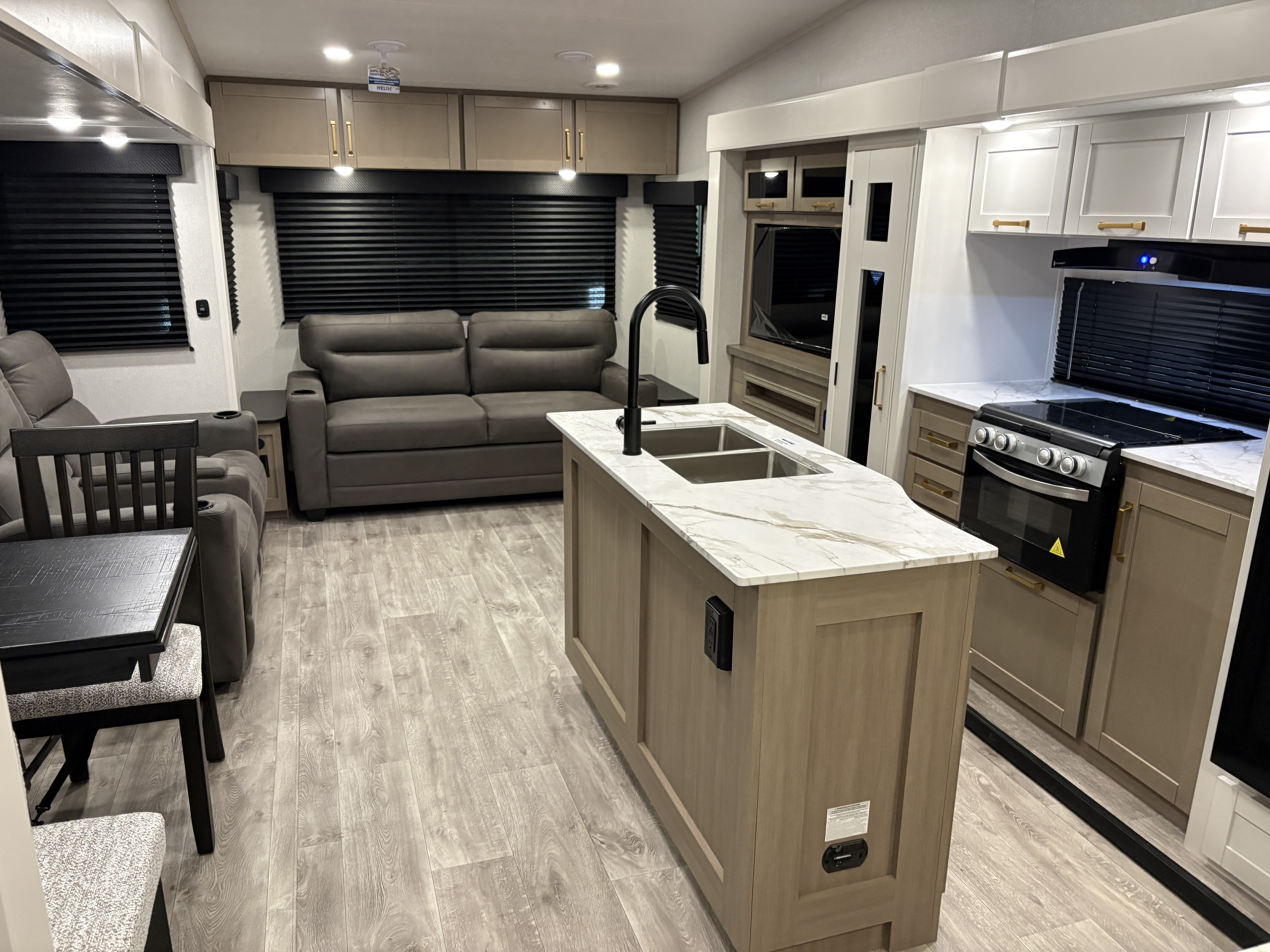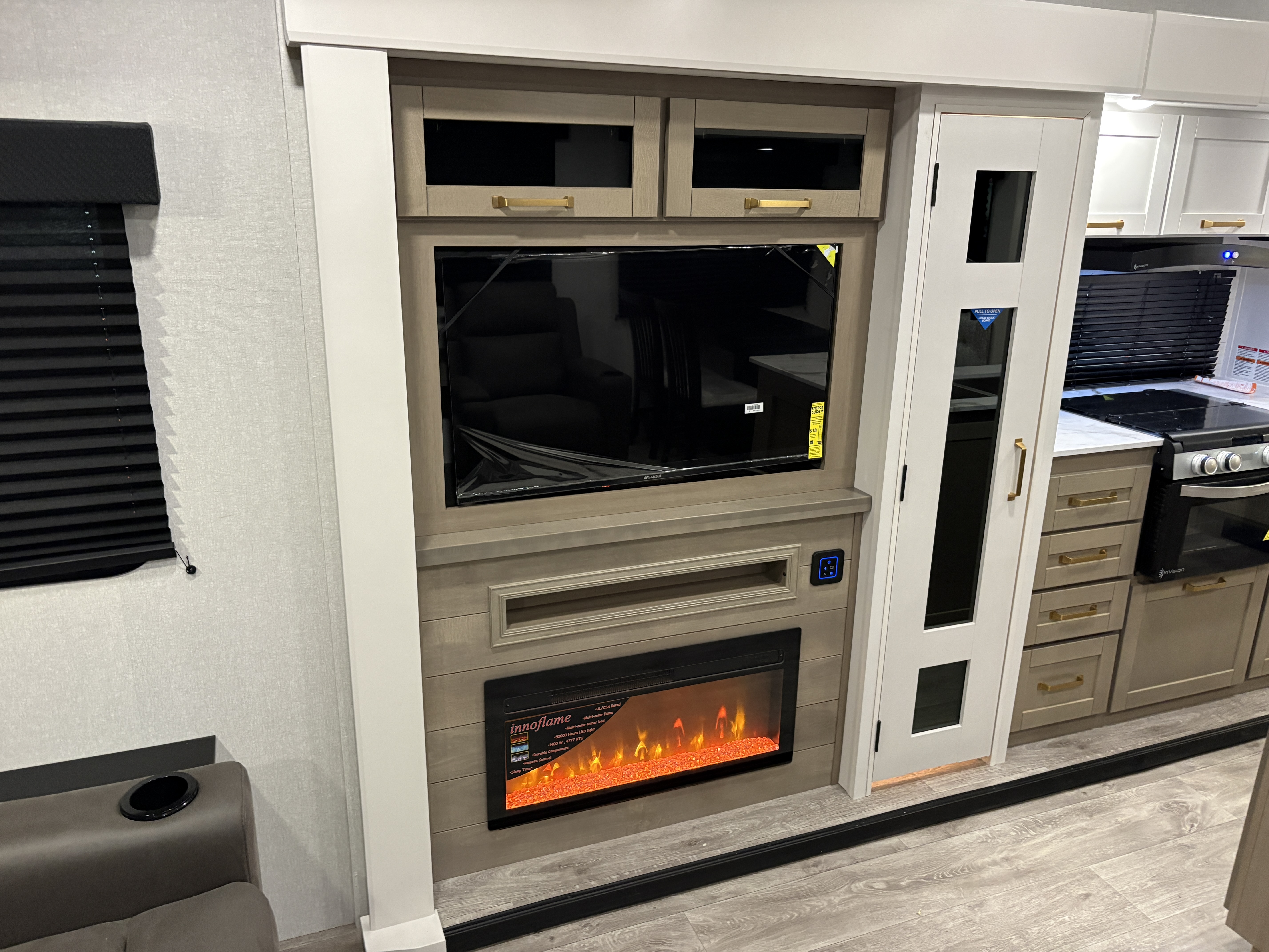 Step inside, and you’ll be greeted by an open-concept living space, complete with residential-style finishes and thoughtful details that elevate your RV experience. The Whisper Quiet 15K BTU A/C system ensures a peaceful retreat, while the HELIX Cooling System™ dual-duct design keeps temperatures steady, even in the summer heat. Relax by the optional LED fireplace with a 5,000 BTU space heater, perfect for cozying up on chilly nights. The deep stainless-steel sink with a pull-out sprayer, spacious countertops, and full-extension 75-lb. drawer guides make meal prep effortless. The tri-fold hide-a-bed sofa with a memory foam sleep surface (select models) ensures every guest sleeps in comfort. With USB-C charging ports, a 40” 4K Ultra LED HD Smart TV, and Bluetooth audio connectivity, your entertainment is always at your fingertips.
