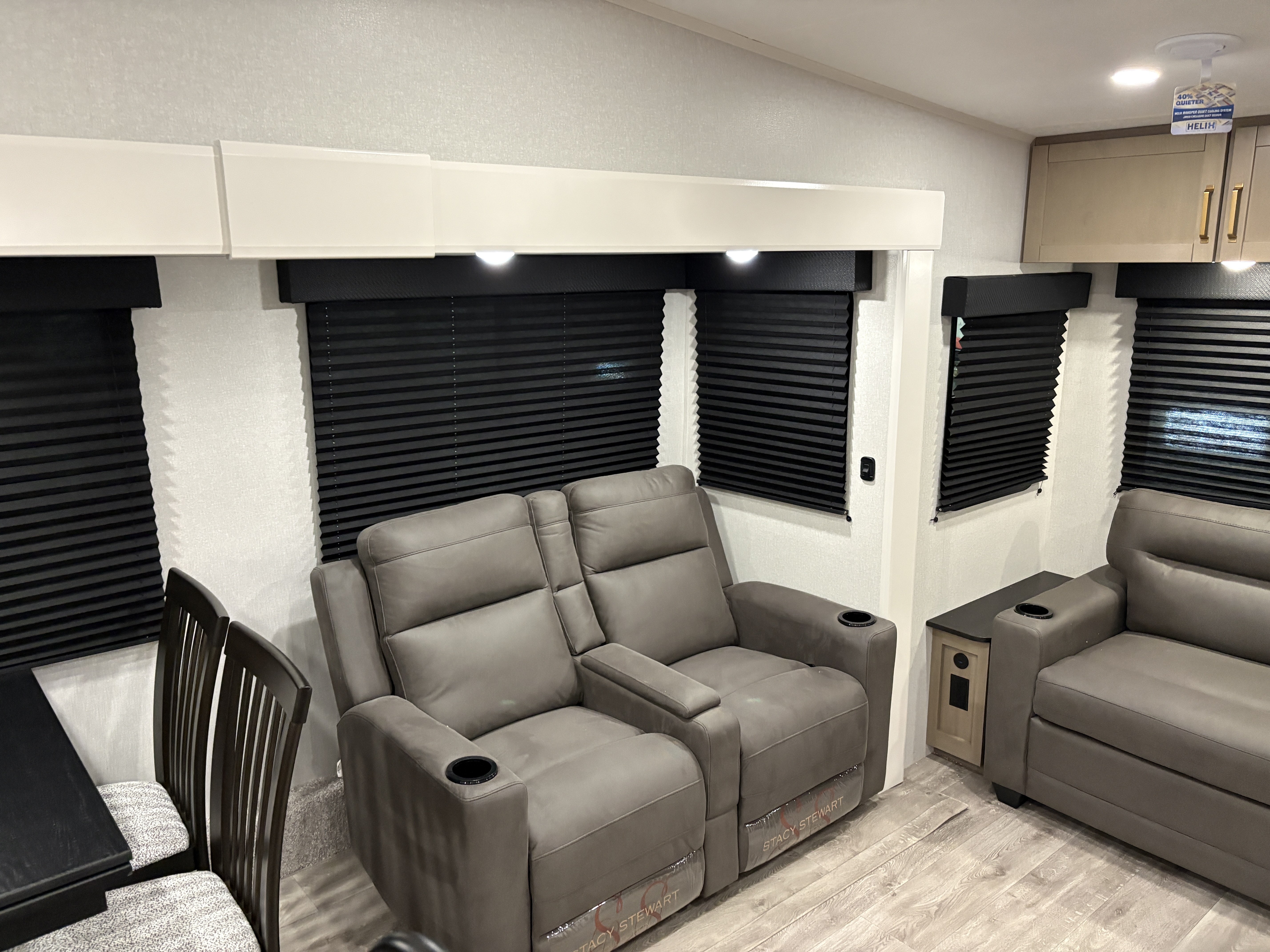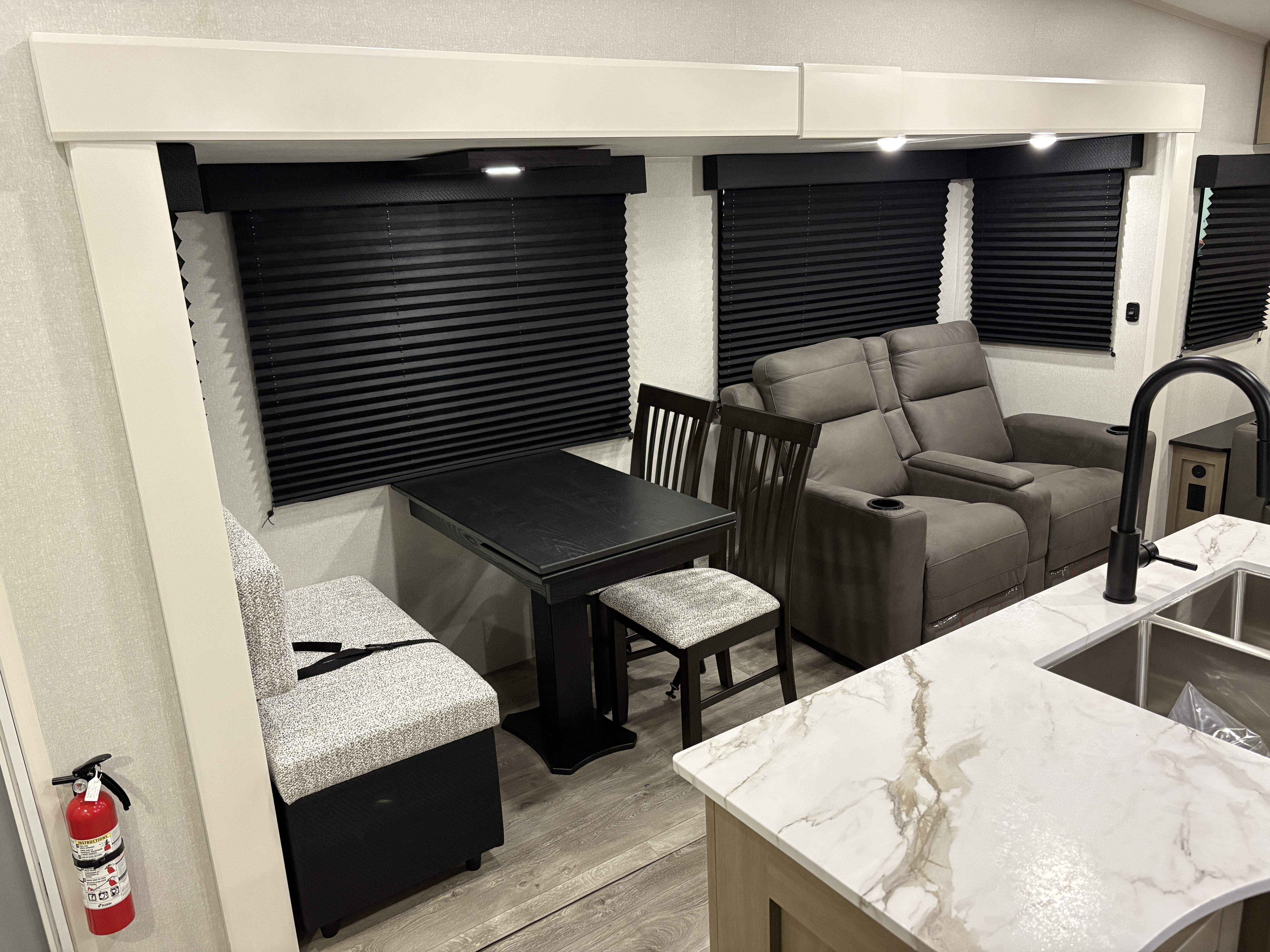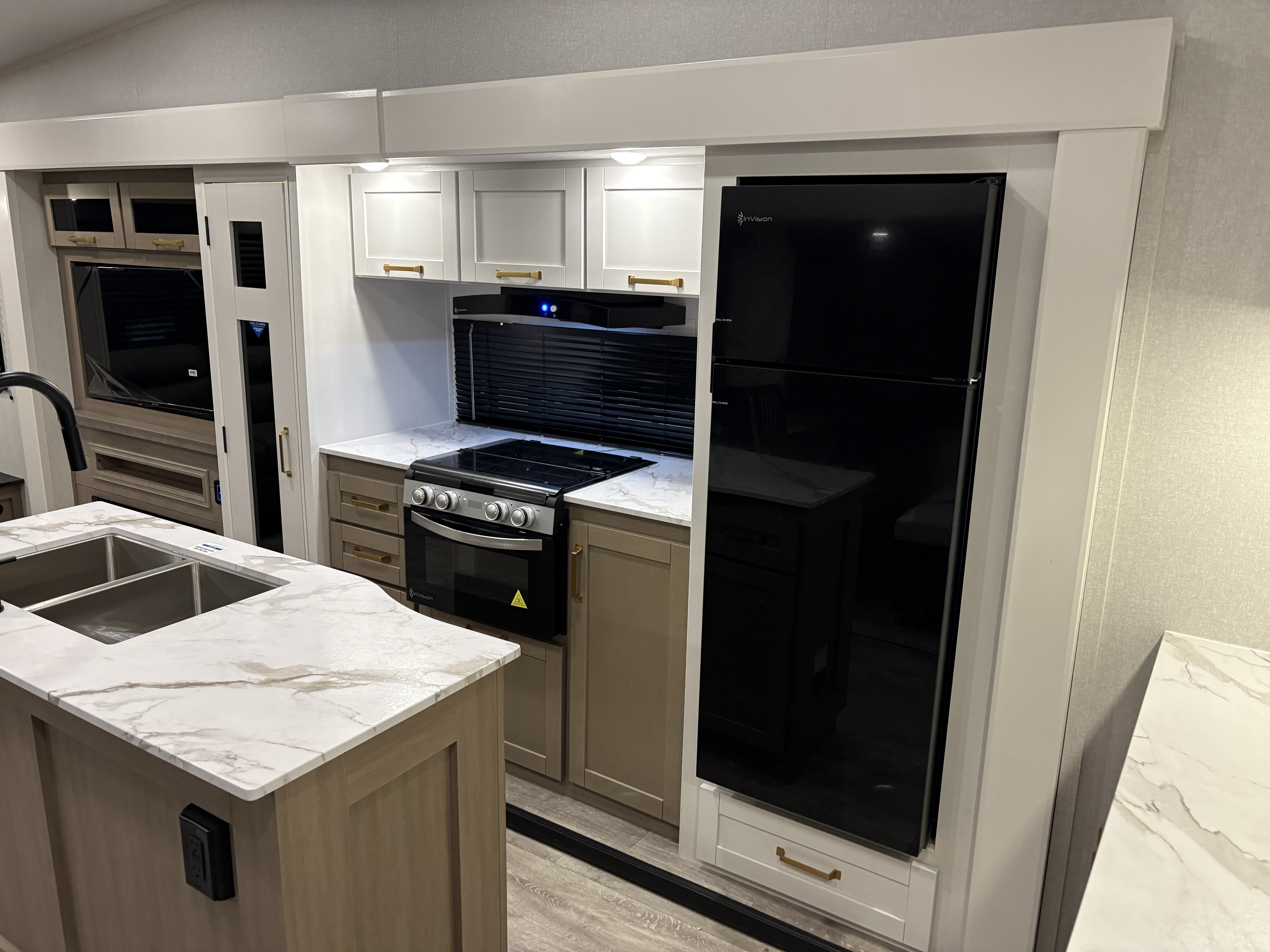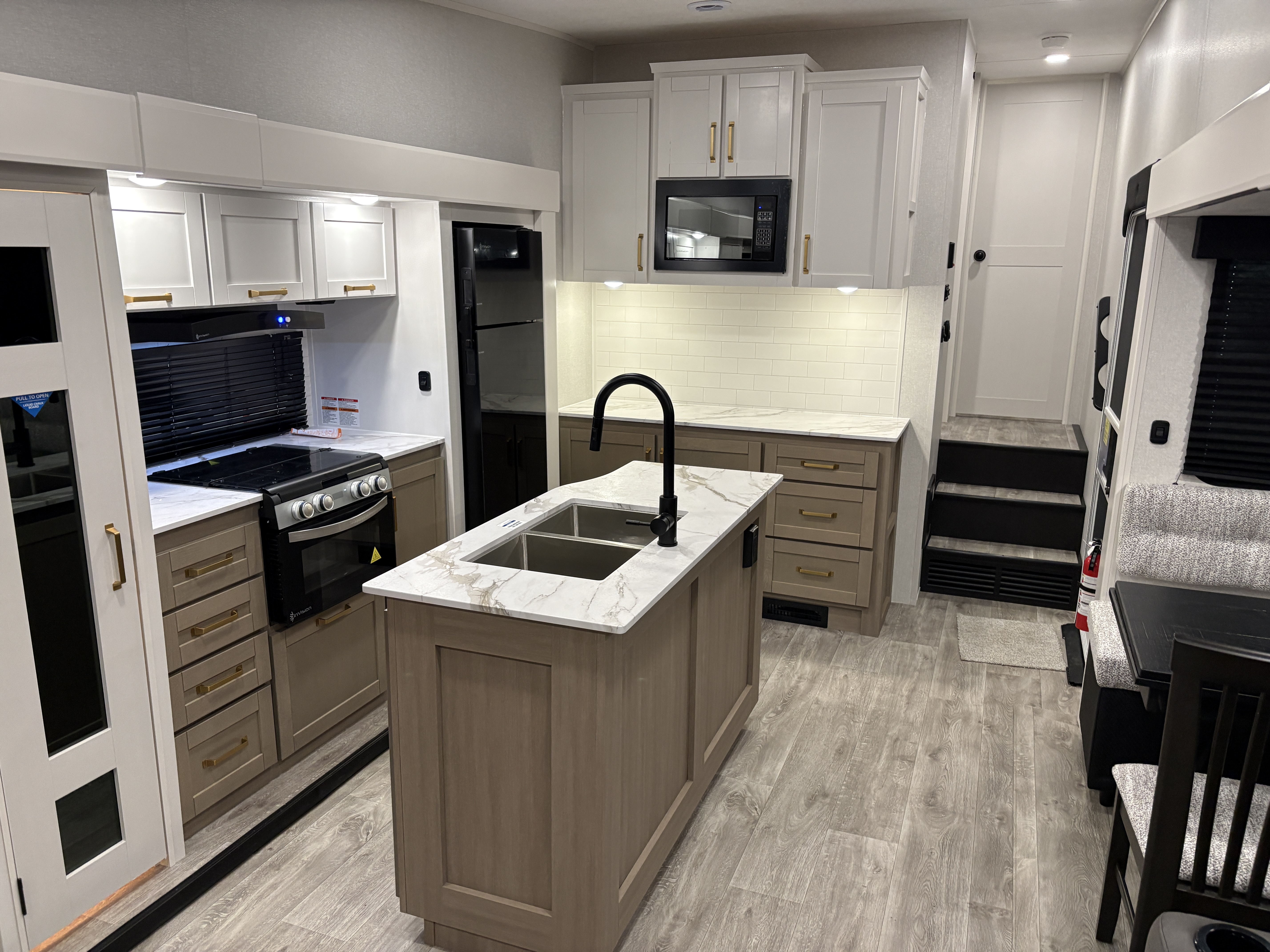 Step inside, and you’ll be greeted by an open-concept living space, complete with residential-style finishes and thoughtful details that elevate your RV experience. The Whisper Quiet 15K BTU A/C system ensures a peaceful retreat, while the HELIX Cooling System™ dual-duct design keeps temperatures steady, even in the summer heat. Relax by the optional LED fireplace with a 5,000 BTU space heater, perfect for cozying up on chilly nights. The deep stainless-steel sink with a pull-out sprayer, spacious countertops, and full-extension 75-lb. drawer guides make meal prep effortless. The tri-fold hide-a-bed sofa with a memory foam sleep surface (select models) ensures every guest sleeps in comfort. With USB-C charging ports, a 40” 4K Ultra LED HD Smart TV, and Bluetooth audio connectivity, your entertainment is always at your fingertips.