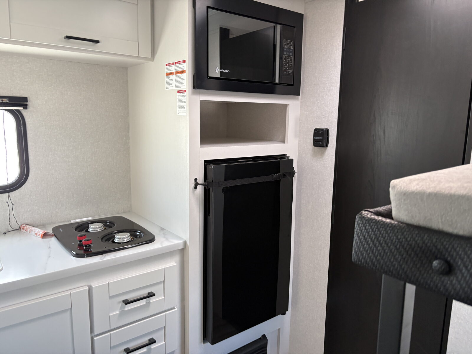 Inside, you’ll find solid hardwood cabinet doors with hidden hinges, giving the space a modern, residential feel. Oversized cabinets and under-bed storage ensure there’s room for everything you need, while the lit exterior passthrough storage makes packing and unpacking a breeze.