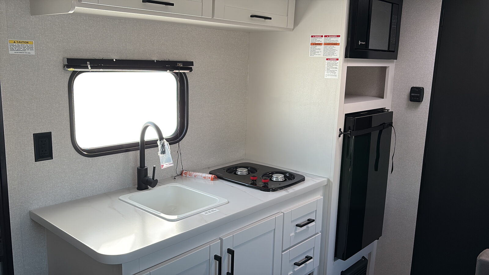 After a long day of exploring, step inside to enjoy instant hot water from the on-demand tankless water heater—up to 60,000 BTU in standard models and 42,000 BTU in the Sport Edition—so you can clean up comfortably, just like at home. Oversized G20 dark-tinted windows flood the space with natural light while blocking heat and UV rays, giving you both stunning views and added privacy.