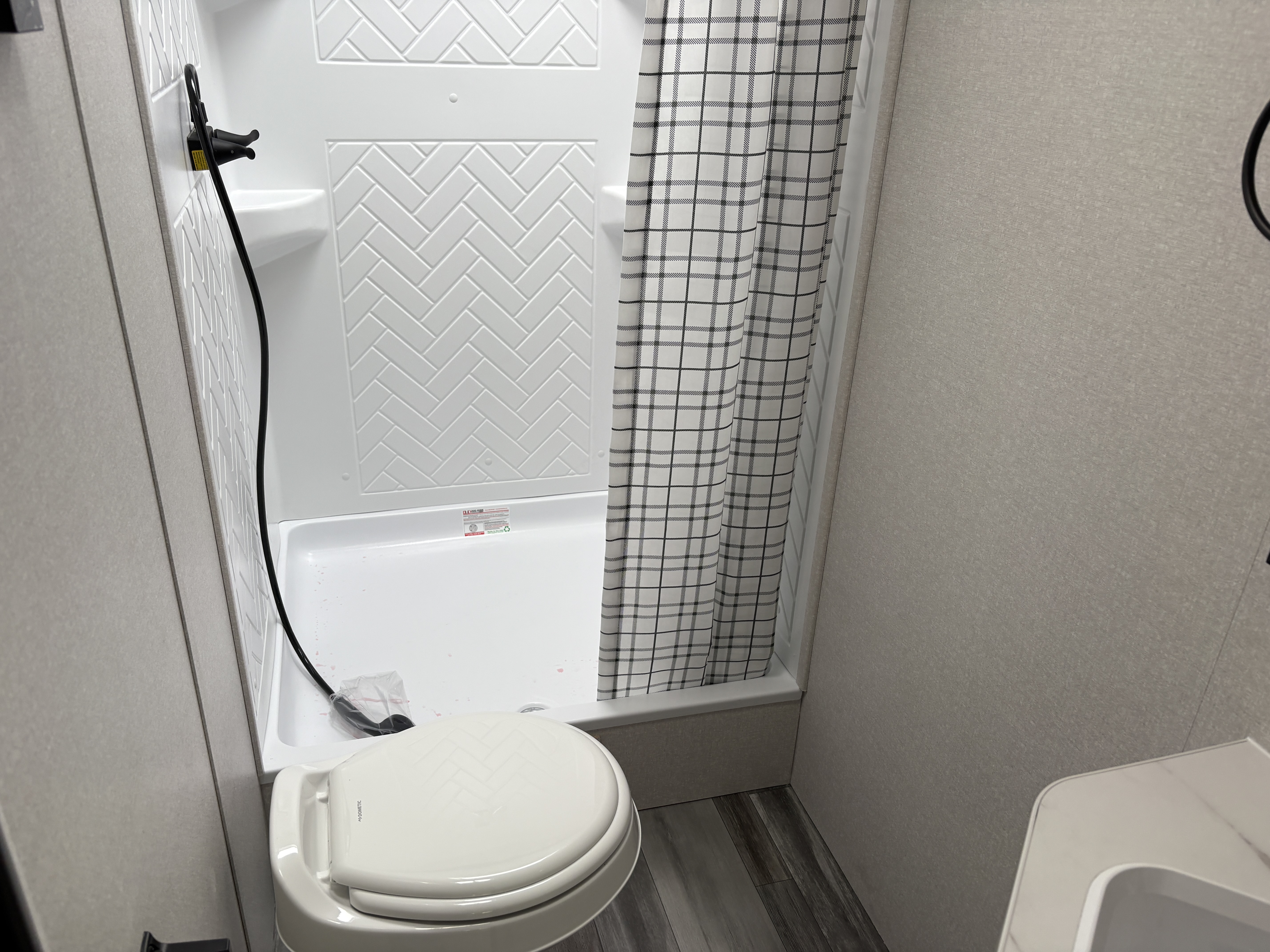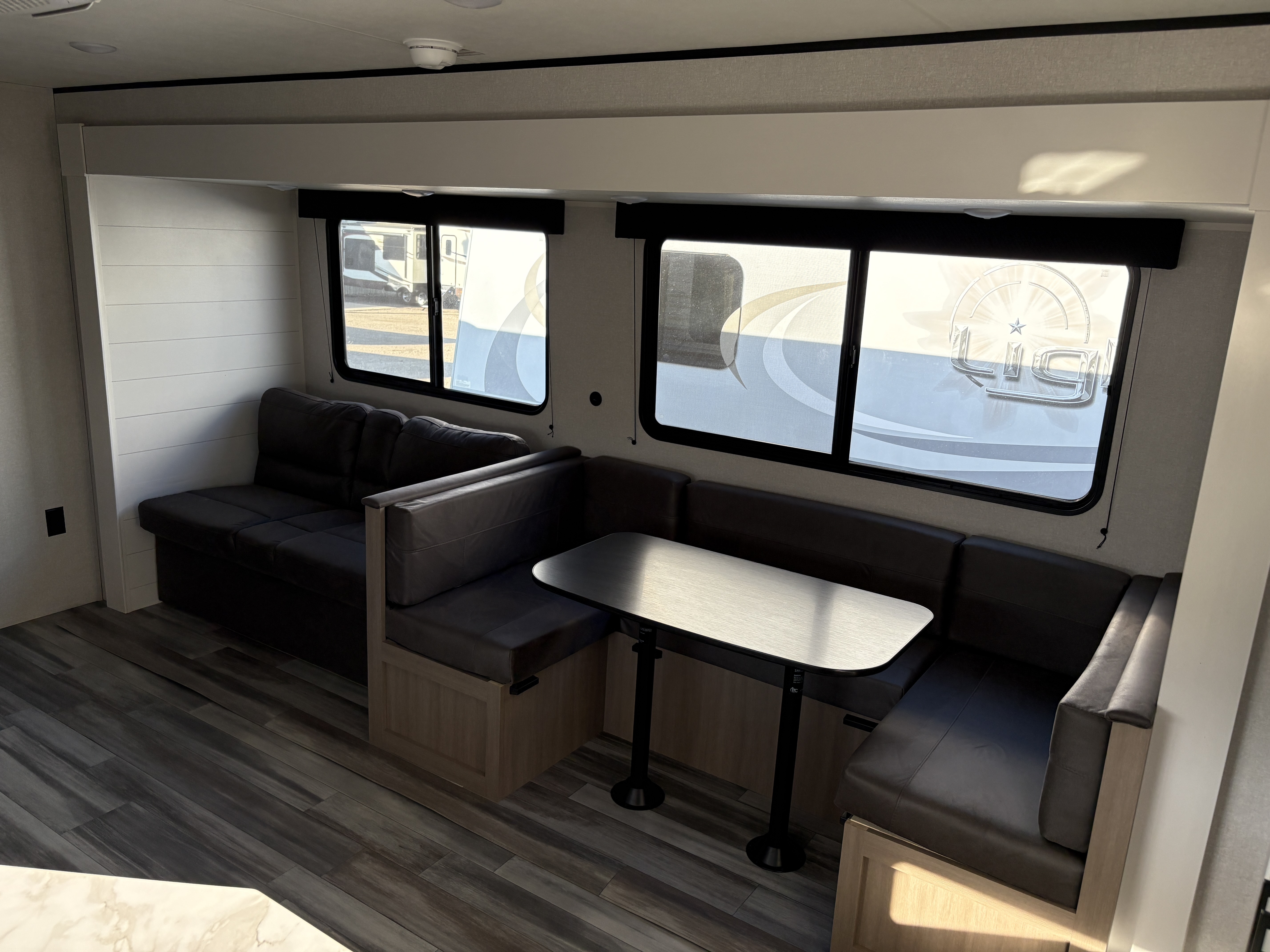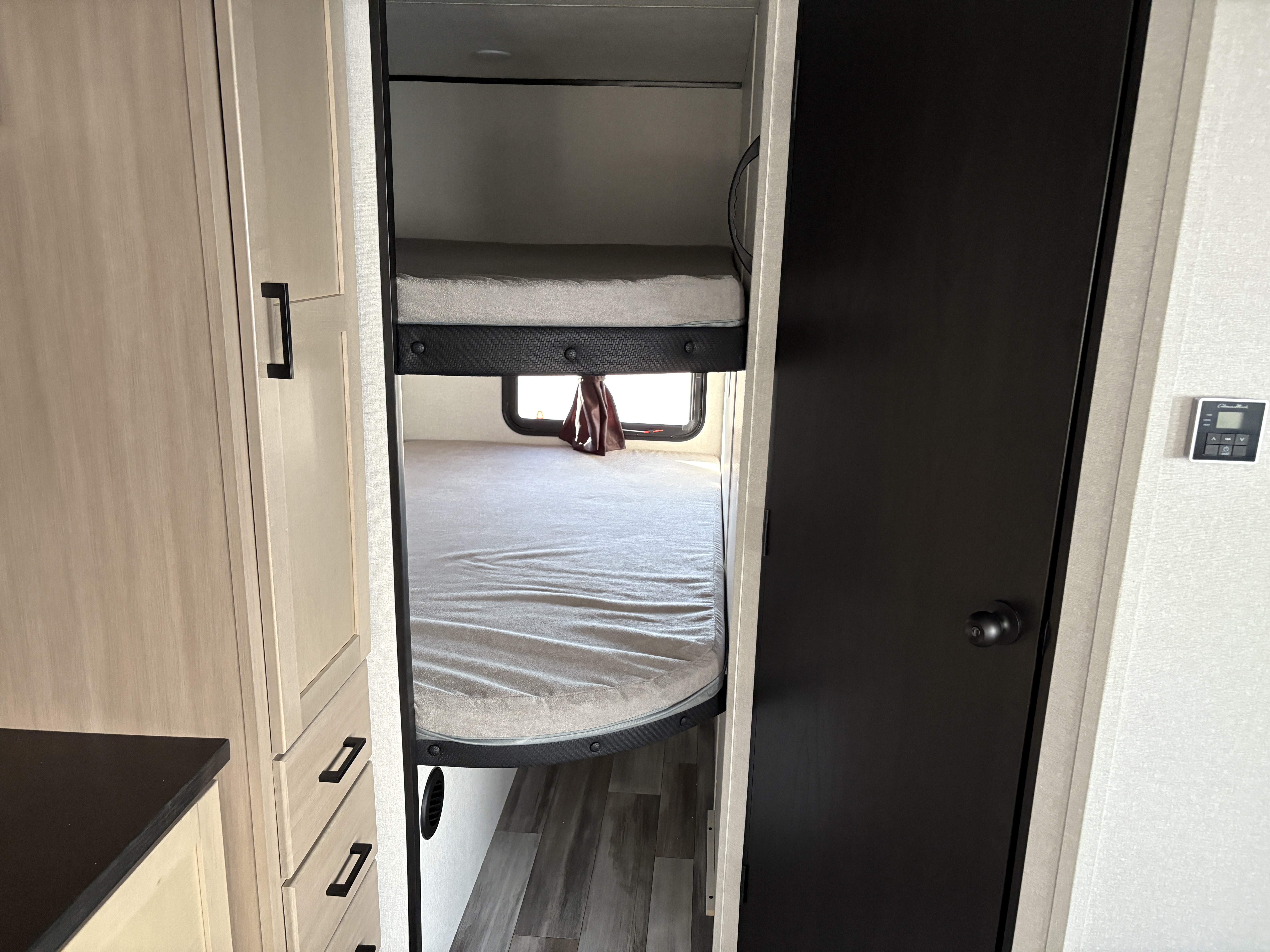 Inside, you’ll find solid hardwood cabinet doors with hidden hinges, giving the space a modern, residential feel. Oversized cabinets and under-bed storage ensure there’s room for everything you need, while the lit exterior passthrough storage makes packing and unpacking a breeze.