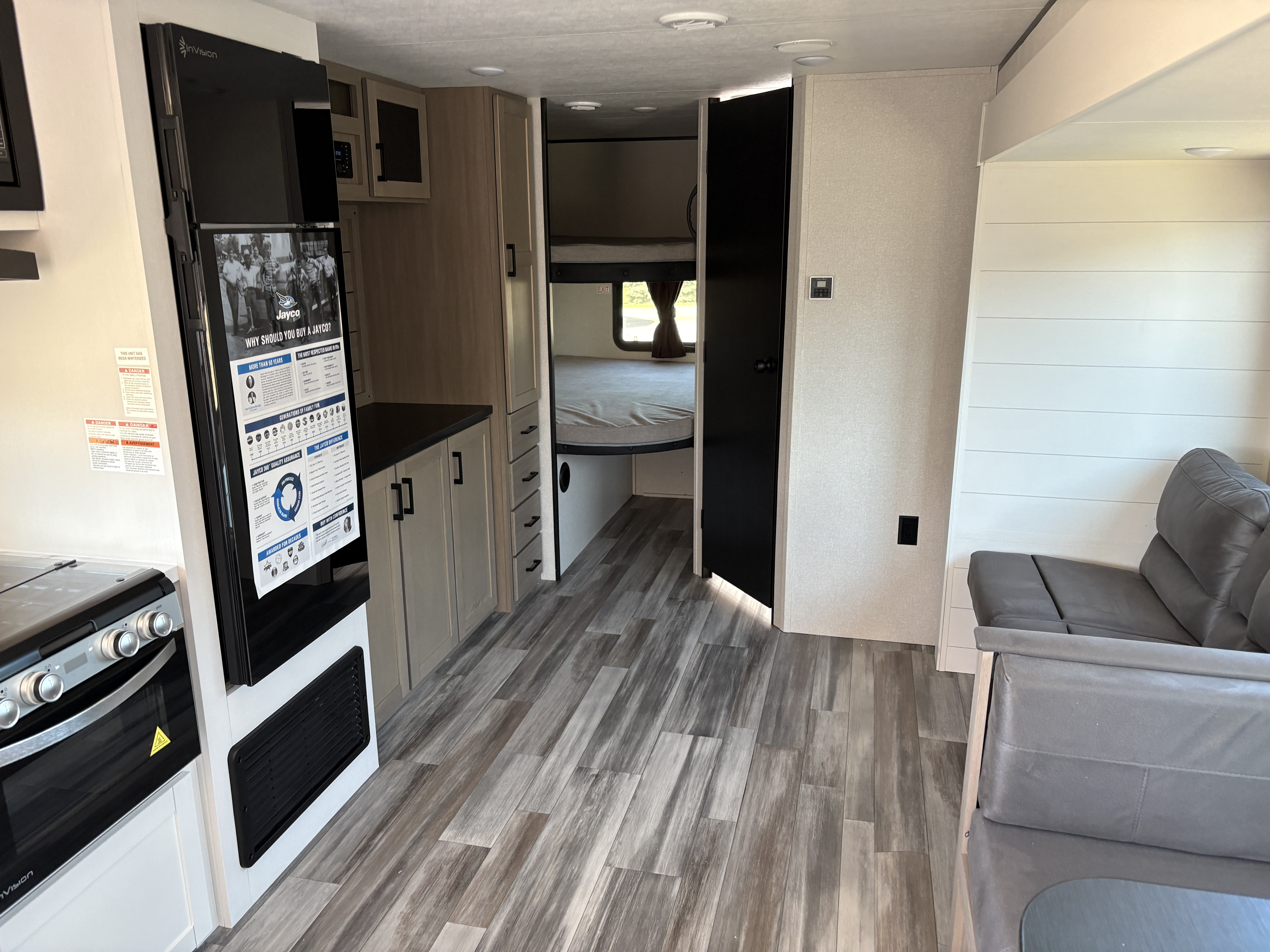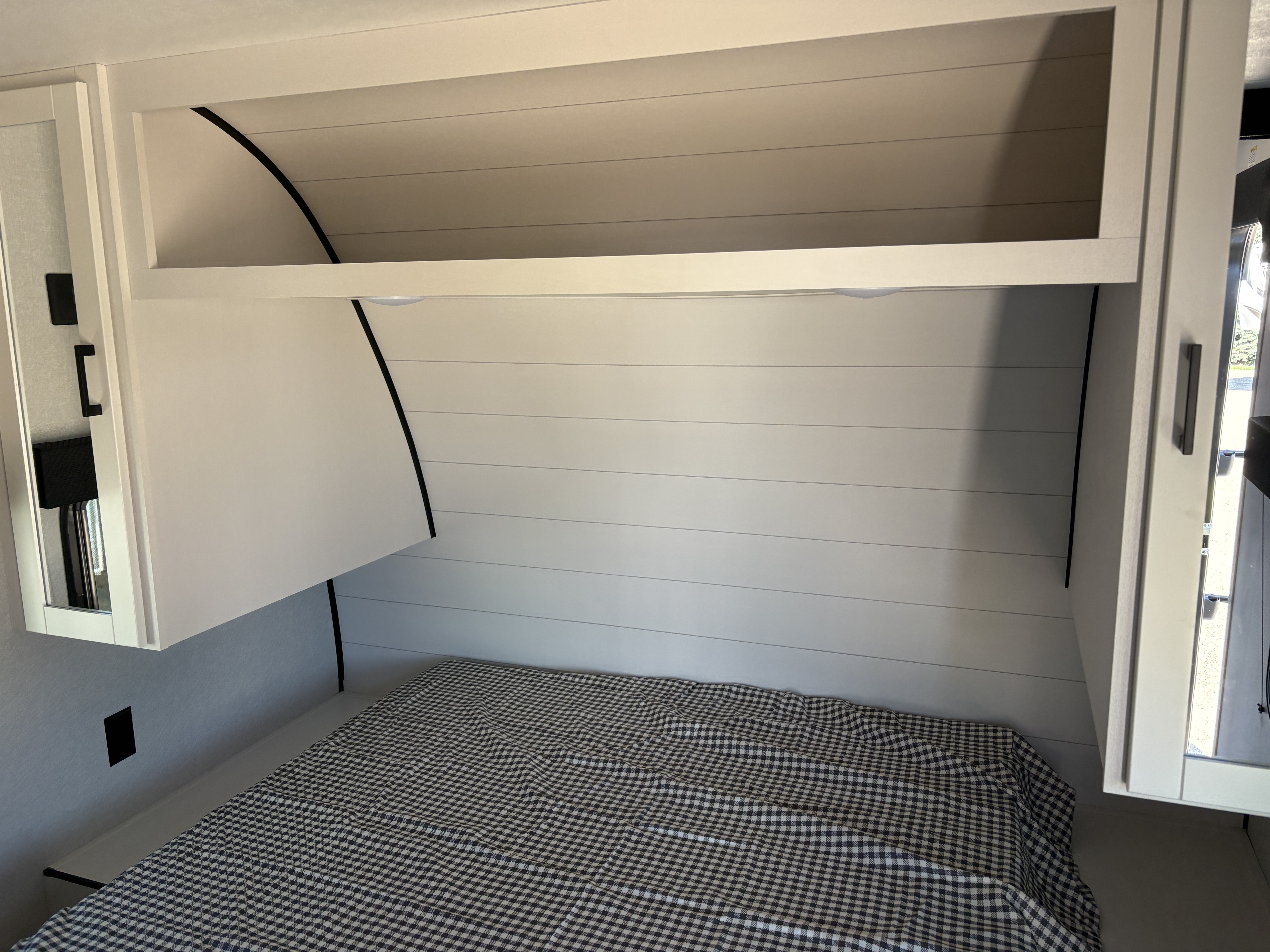 Inside, you’ll find solid hardwood cabinet doors with hidden hinges, giving the space a modern, residential feel. Oversized cabinets and under-bed storage ensure there’s room for everything you need, while the lit exterior passthrough storage makes packing and unpacking a breeze.