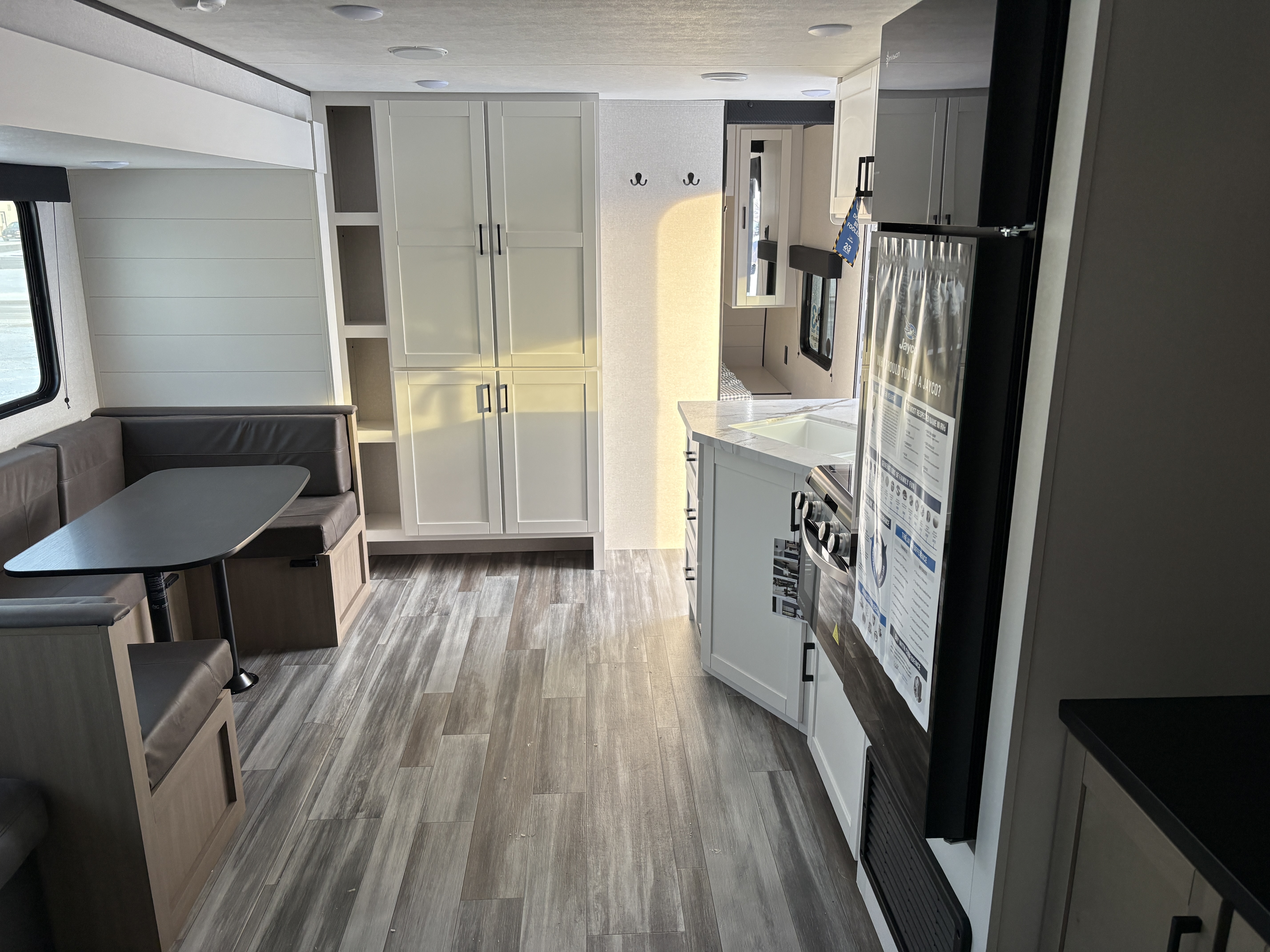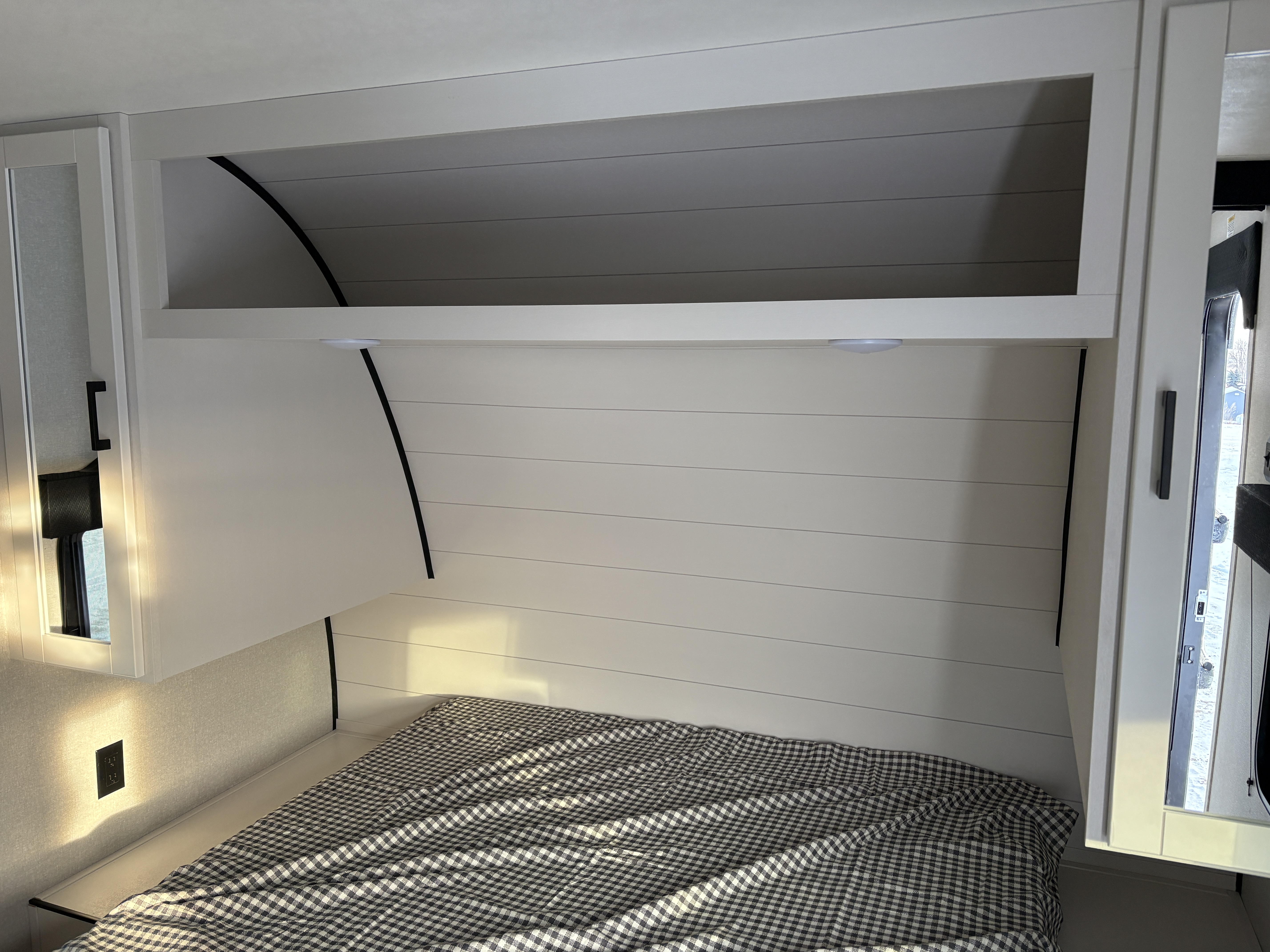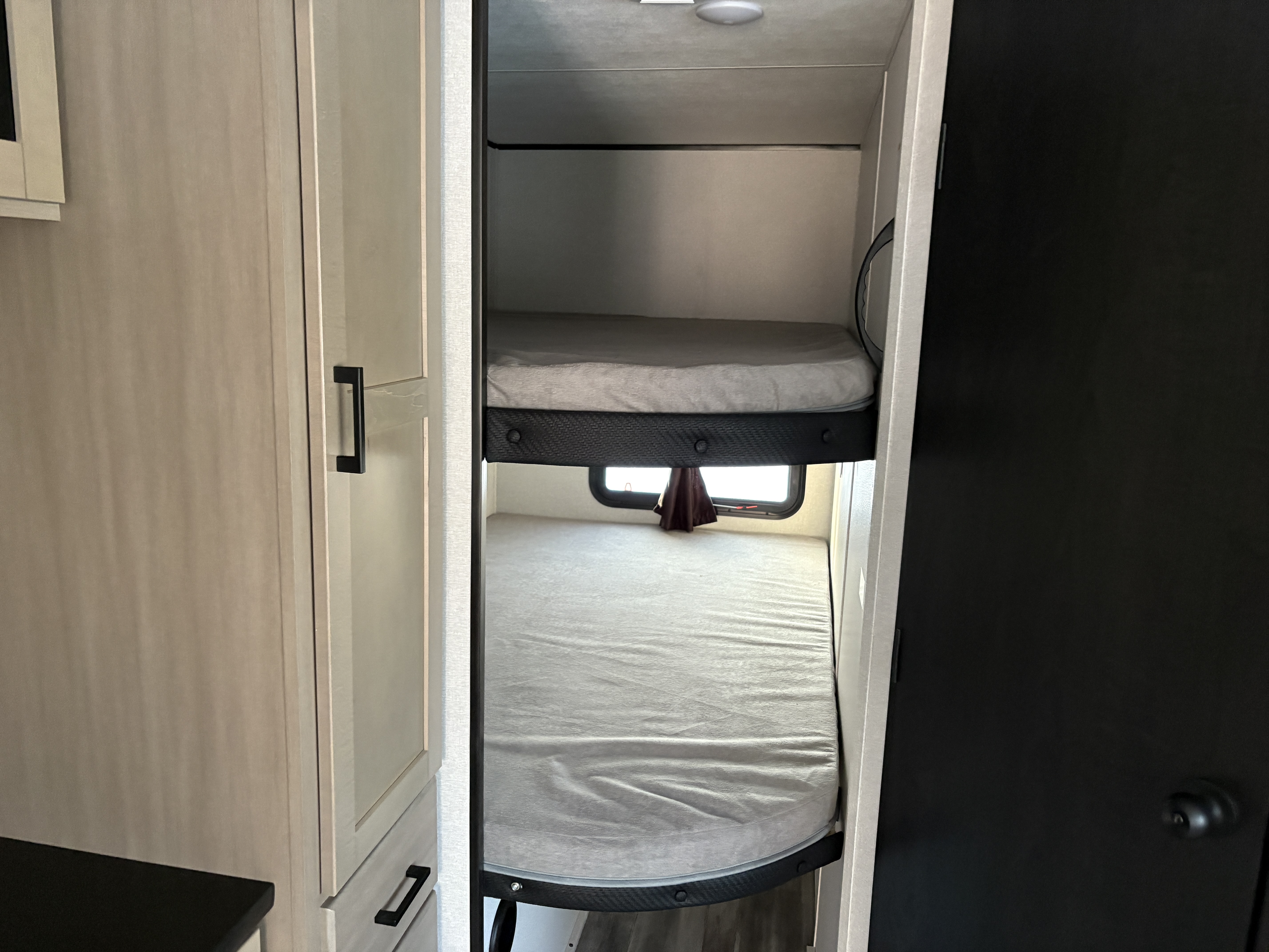 Inside, you’ll find solid hardwood cabinet doors with hidden hinges, giving the space a modern, residential feel. Oversized cabinets and under-bed storage ensure there’s room for everything you need, while the lit exterior passthrough storage makes packing and unpacking a breeze.