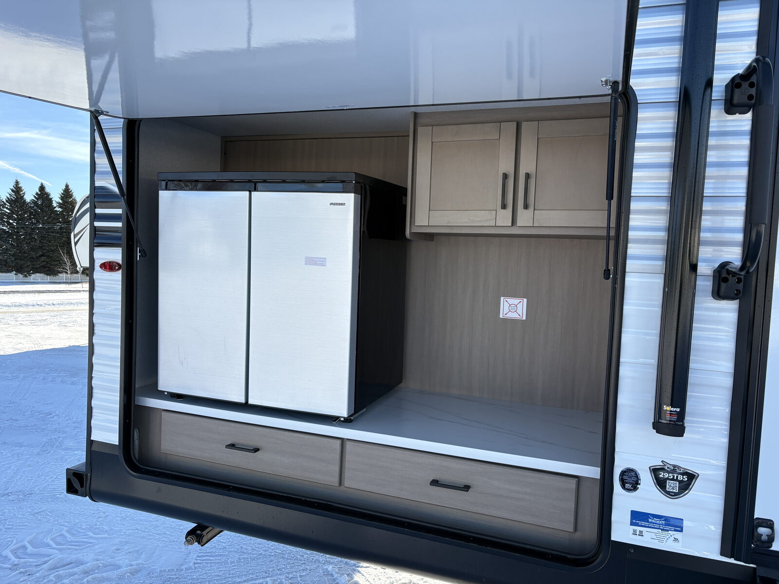Inside, you’ll find solid hardwood cabinet doors with hidden hinges, giving the space a modern, residential feel. Oversized cabinets and under-bed storage ensure there’s room for everything you need, while the lit exterior passthrough storage makes packing and unpacking a breeze.