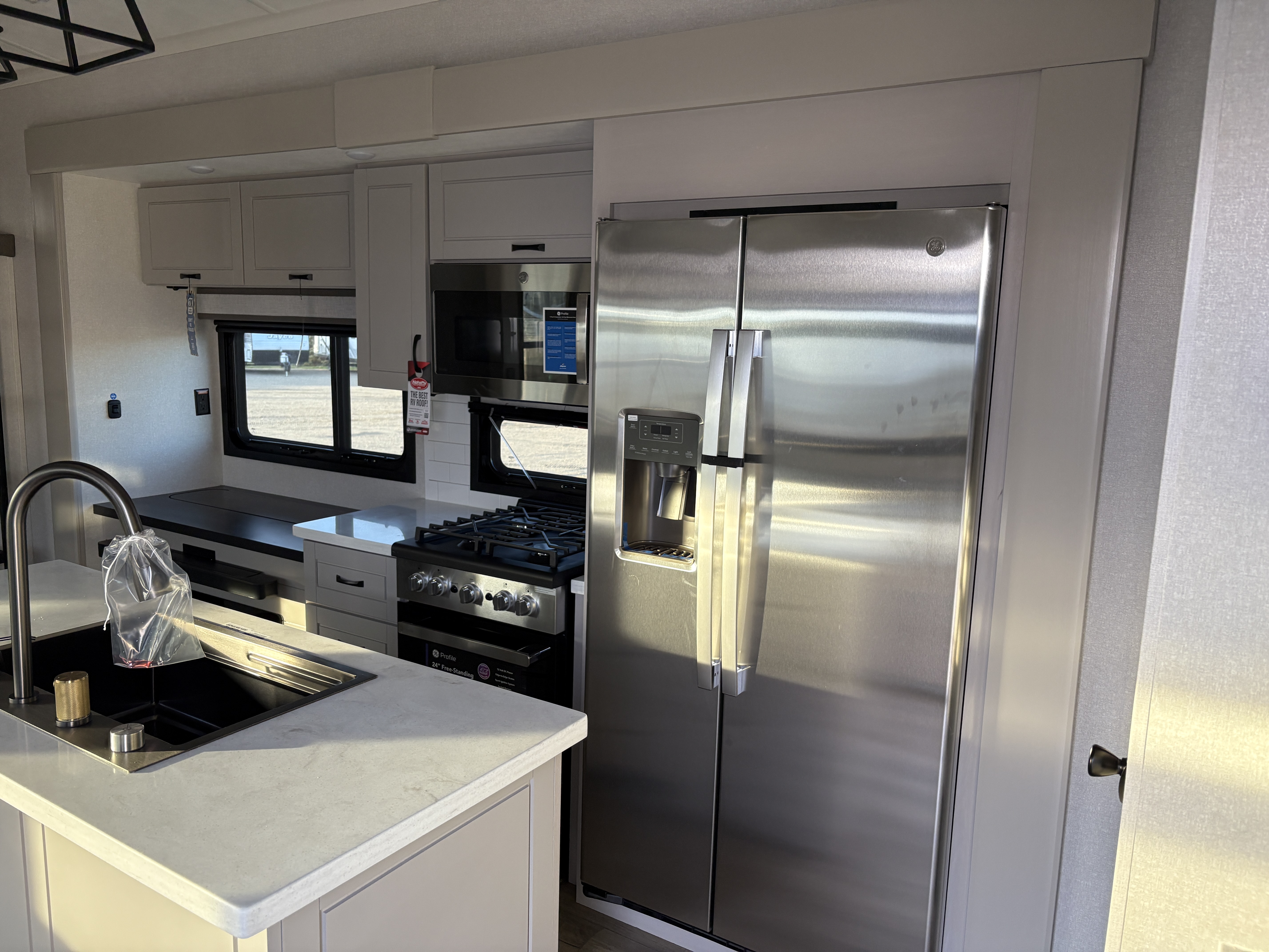 At camp, the 102-inch wide-body frame opens up to reveal a spacious interior rich with residential-grade finishes. Culinary conveniences abound with GE® Profile appliances, including a 21-cu. ft. refrigerator, 30-inch convection microwave with air fryer and a 24-inch gas range—bringing the full kitchen experience on the road. Relax in style with true residential furnishings, a JBL® sound system with subwoofer and a cozy electric fireplace, all designed for ultimate comfort and downtime.