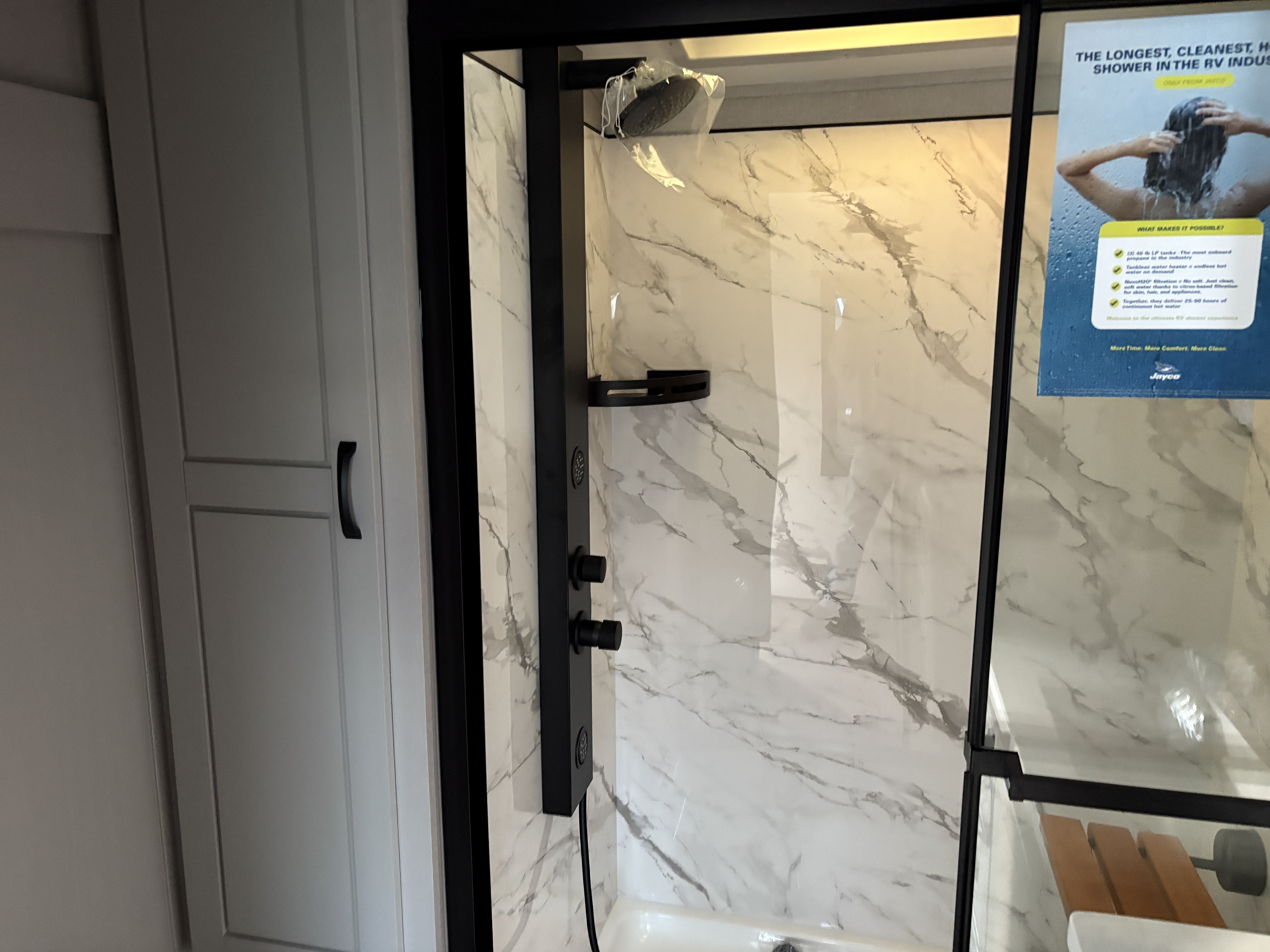 Climate control is made effortless with Jayco’s exclusive HELIX Cooling System™, while three 40-lb. propane tanks give you extended freedom for off-grid stays. In the bathroom, a residential walk-in shower with a teak seat, premium fixtures and spa-inspired details turn routine into indulgence.