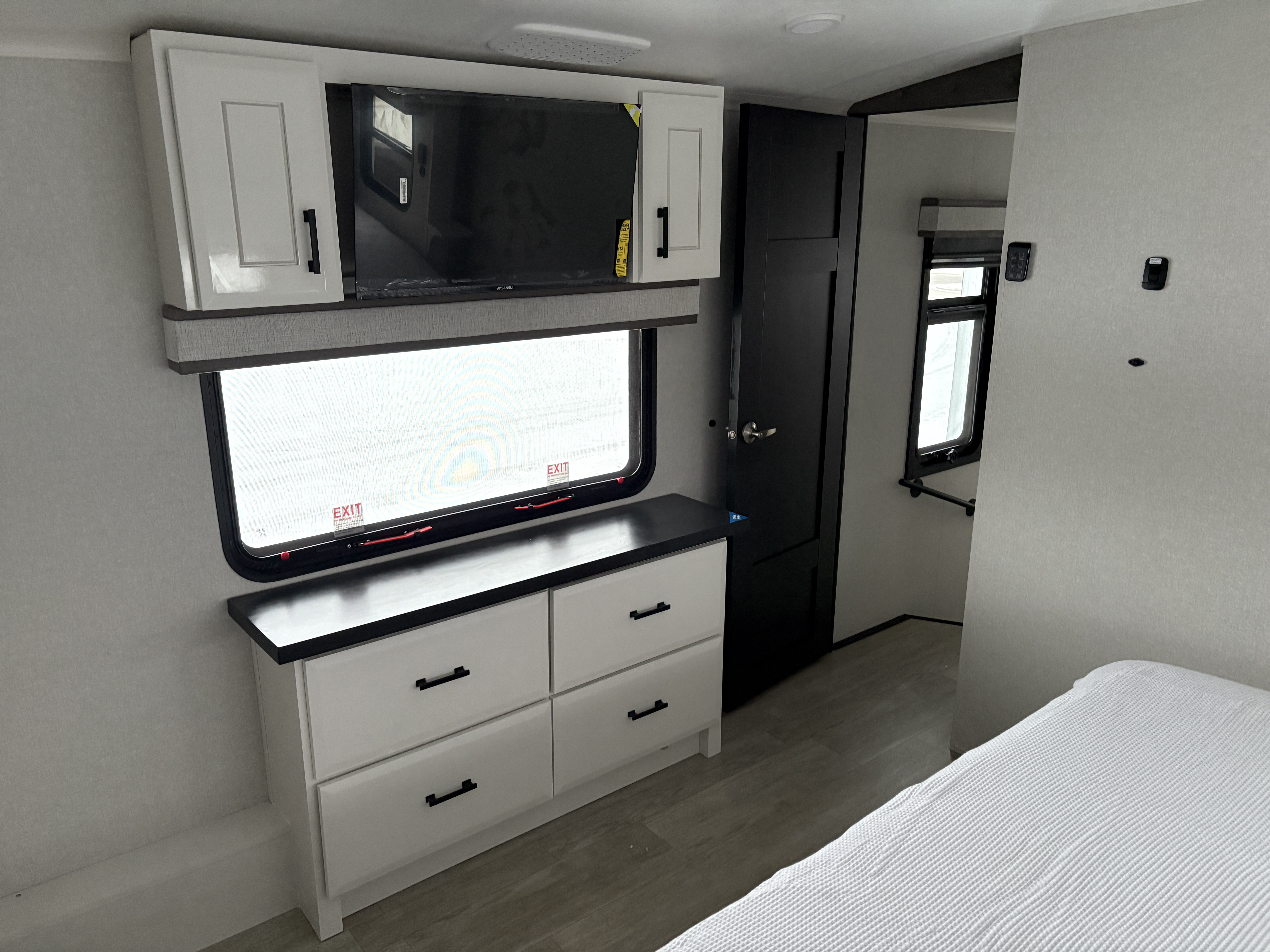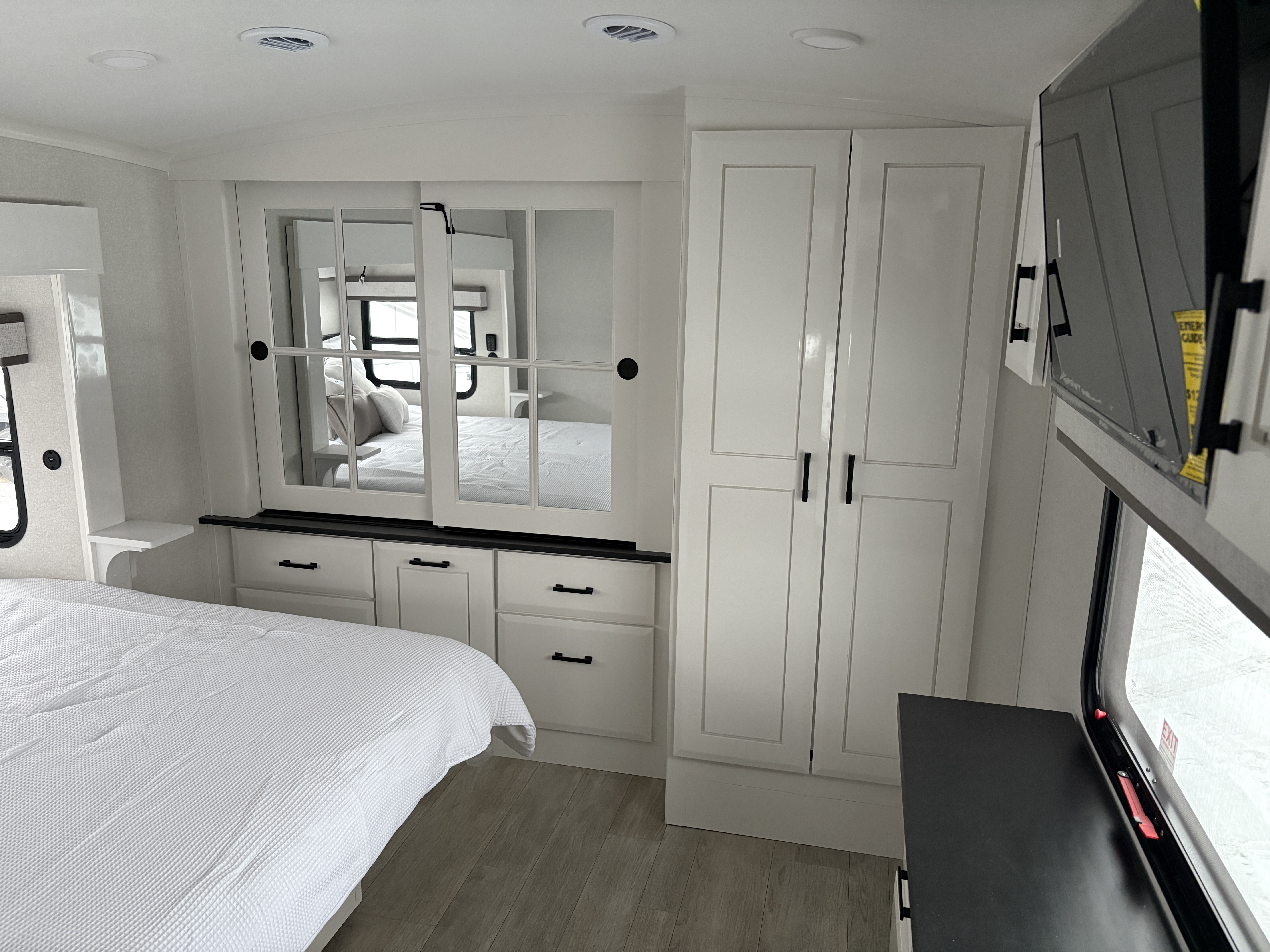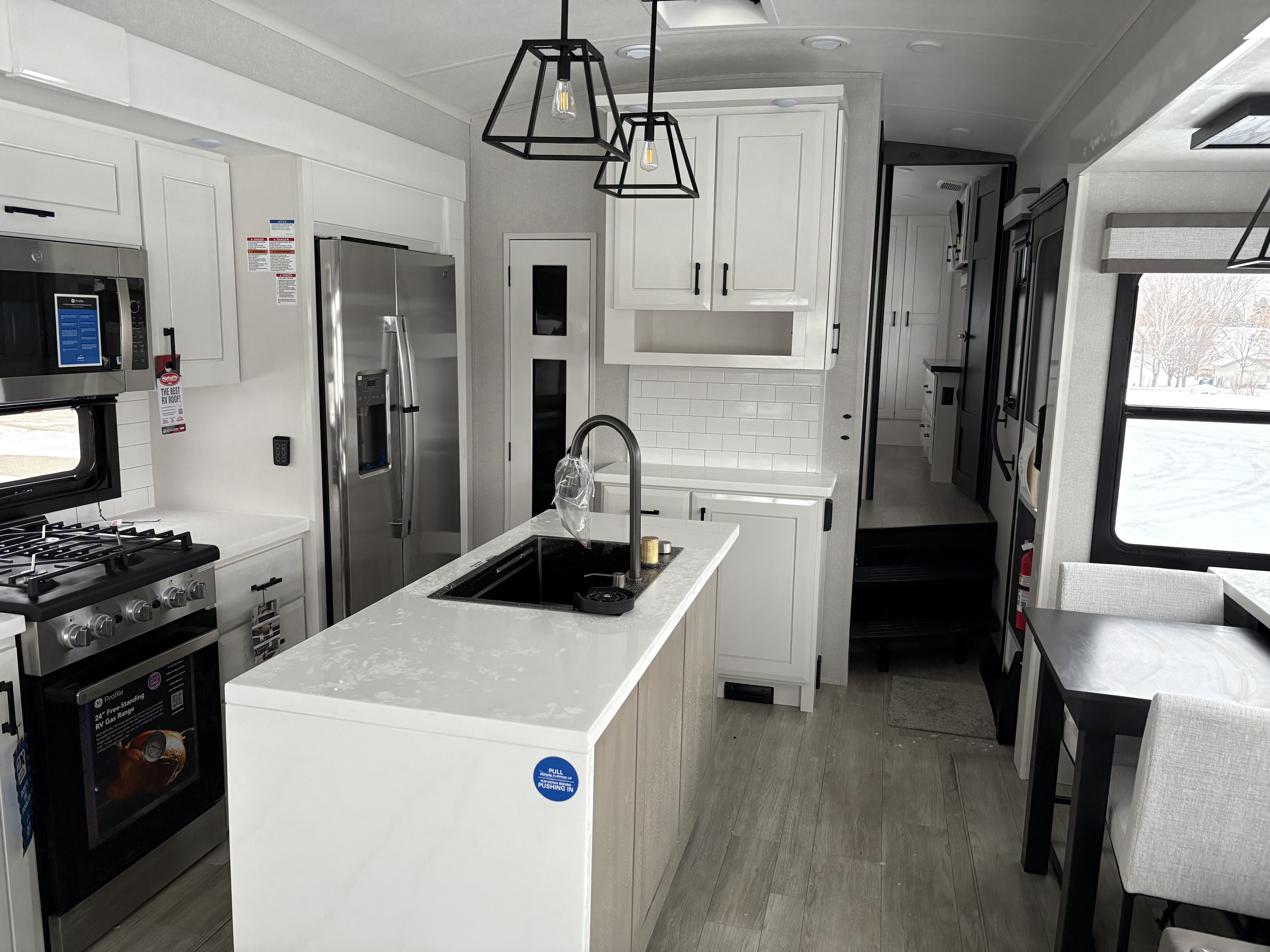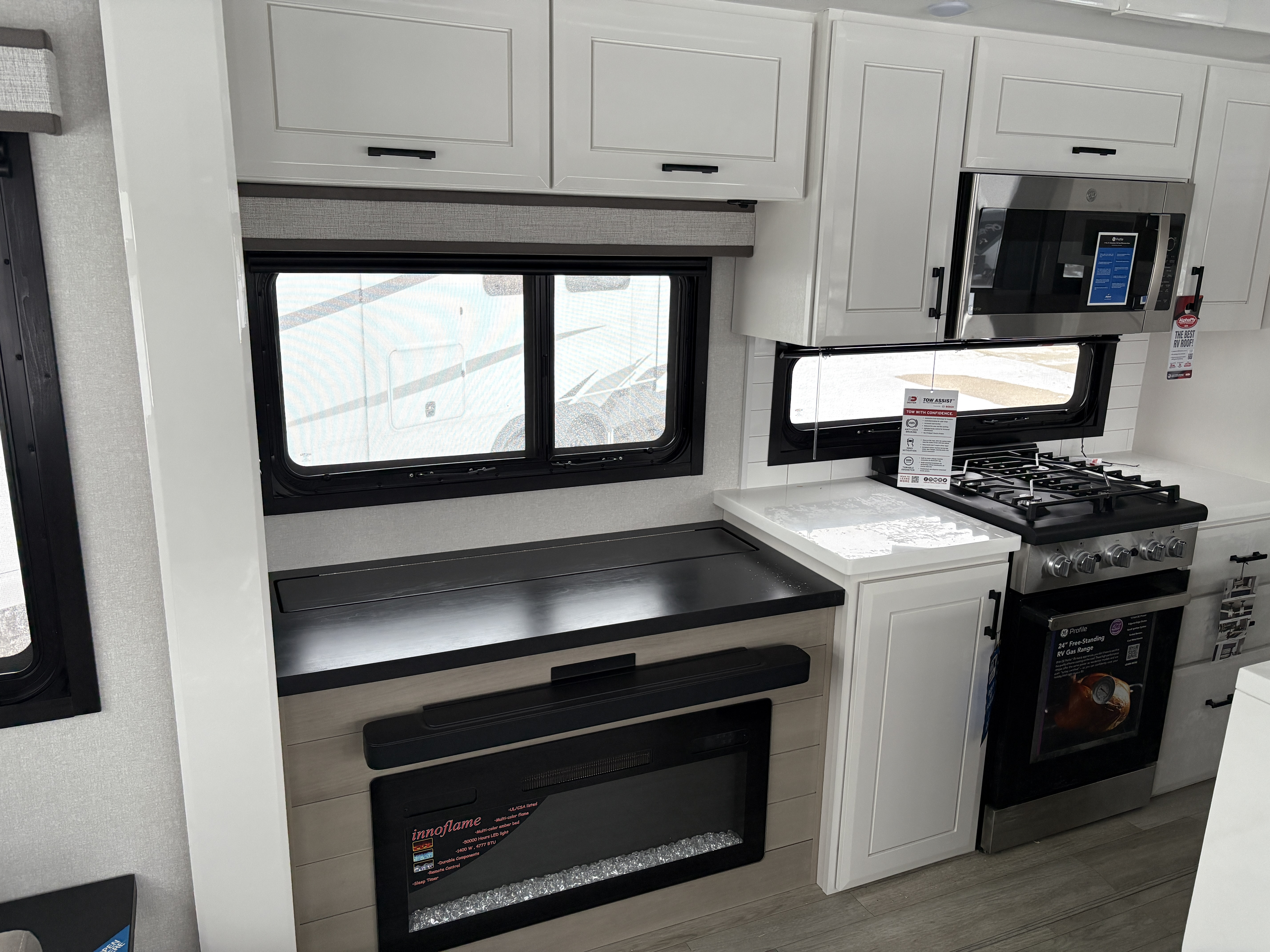 Step inside and experience the Jayco difference. From handcrafted solid hardwood maple cabinetry to sleek solid-surface countertops, every detail reflects intentional design and superior build quality. GE’s premium kitchen suite includes a 21 cu. ft. residential refrigerator, a 30 in. convection microwave with built-in air fryer, and a 24 in. high-output range—along with an available built-in dishwasher and extended bar top for effortless entertaining.