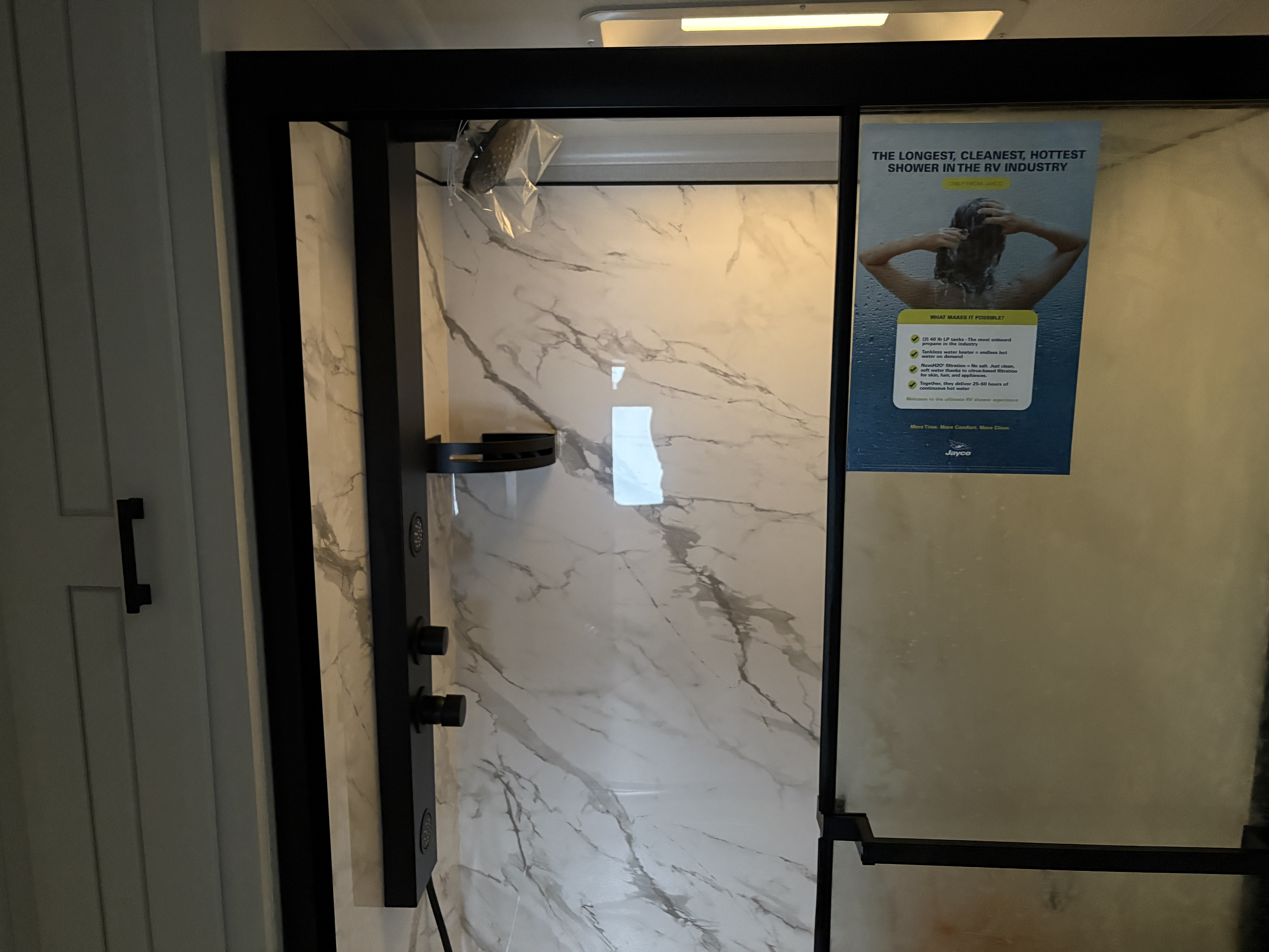 Pinnacle also features the AquaLuxe package—a premium setup that includes a high-capacity tankless water heater, (3) 40-lb. propane bottles for extended use, and the NuvoH2O filtration system. Together, they deliver instant hot water, longer off-grid capability and consistently cleaner, better-tasting water throughout the coach.